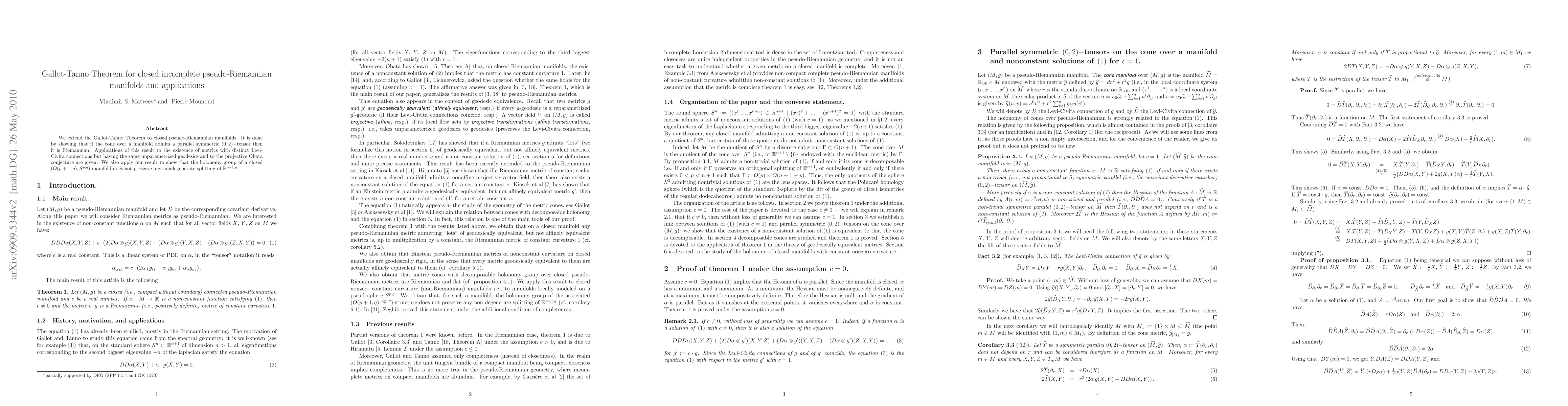 Summary: The paper extends the Gallot-Tanno Theorem to closed pseudo-Riemannian manifolds, demonstrating that if the cone over a manifold has a parallel symmetric tensor, it is Riemannian. Applications include metrics with identical unparametrized geodesics and implications for the projective Obata conjecture, as well as the holonomy group's behavior on $(O(p+1,q),S^{p,q})$-manifolds.