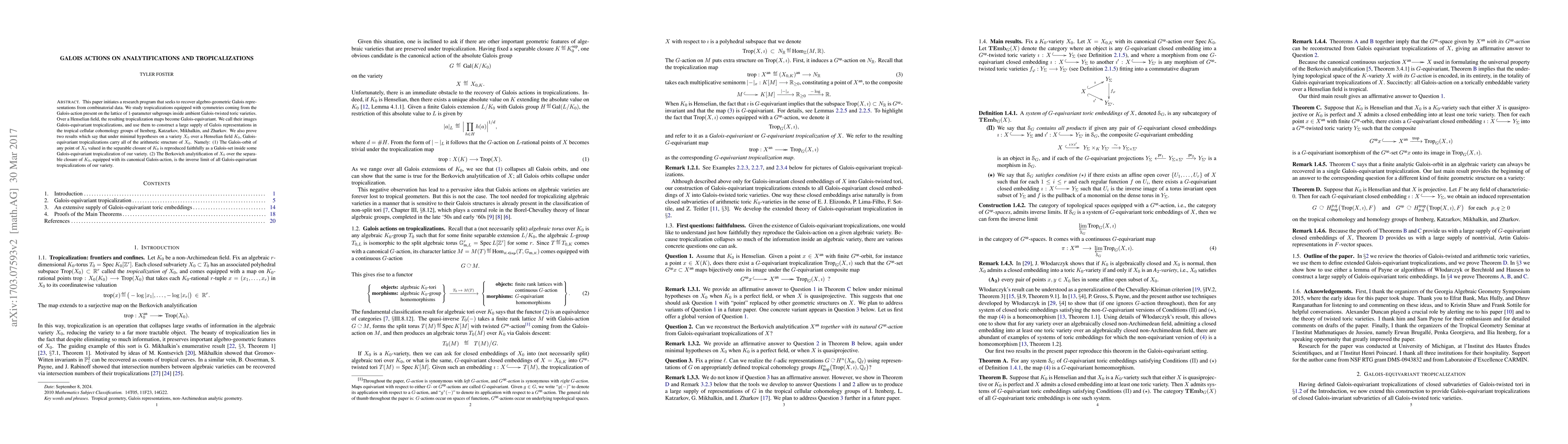 This paper initiates a research program that seeks to recover algebro-geometric Galois representations from combinatorial data. We study tropicalizations equipped with symmetries coming from the Galois-action present on the lattice of $1$-parameter subgroups inside ambient Galois-twisted toric varieties. Over a Henselian field, the resulting tropicalization maps become Galois-equivariant. We call their images Galois-equivariant tropicalizations, and use them to construct a large supply of Galois representations in the tropical cellular cohomology groups of Itenberg, Katzarkov, Mikhalkin, and Zharkov. We also prove two results which say that under minimal hypotheses on a variety $X_{0}$ over a Henselian field $K_{0}$, Galois-equivariant tropicalizations carry all of the arithmetic structure of $X_{0}$. Namely: (1) The Galois-orbit of any point of $X_{0}$ valued in the separable closure of $K_{0}$ is reproduced faithfully as a Galois-set inside some Galois-equivariant tropicalization of our variety. (2) The Berkovich analytification of $X_{0}$ over the separable closure of $K_{0}$, equipped with its canonical Galois-action, is the inverse limit of all Galois-equivariant tropicalizations of our variety.
