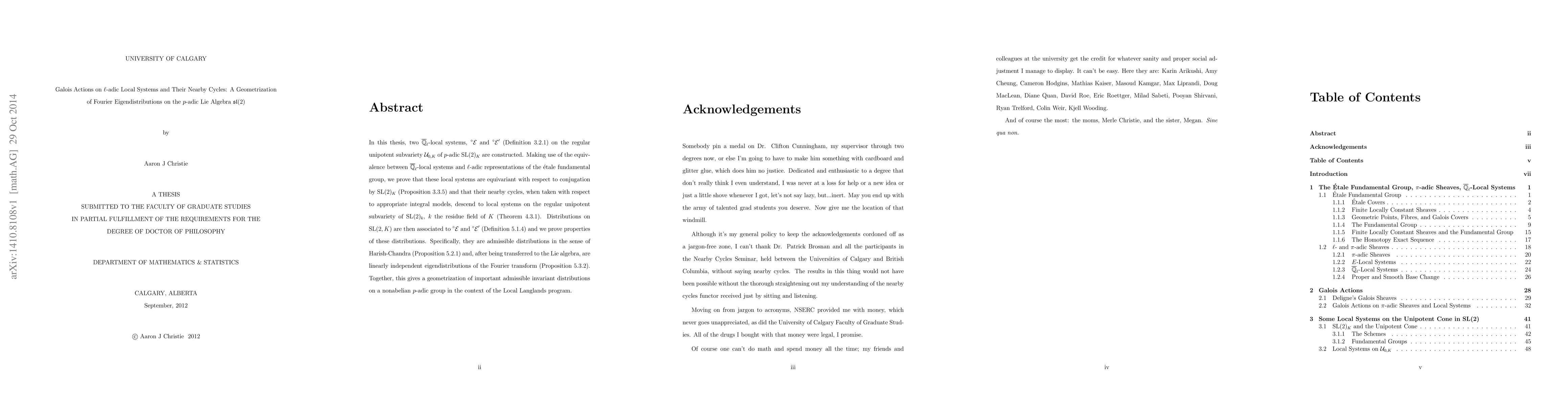 In this thesis, two $\bar{\mathbb{Q}}_\ell$-local systems, $\vphantom{\mathcal{E}}^\circ \mathcal{E}$ and $\vphantom{E}^\circ \mathcal{E}^\prime$ on the regular unipotent subvariety $\mathcal{U}_{0,K}$ of $p$-adic $\operatorname{SL}_2(K)$ are constructed. Making use of the equivalence between $\bar{\mathbb{Q}}_\ell$-local systems and $\ell$-adic representations of the \'etale fundamental group, we prove that these local systems are equivariant with respect to conjugation by $\operatorname{SL}_2(K)$ and that their nearby cycles, when taken with respect to appropriate integral models, descend to local systems on the regular unipotent subvariety of $\operatorname{SL}_2(k)$, $k$ the residue field of $K$. Distributions on $\operatorname{SL}_2(K)$ are then associated to $\vphantom{E}^\circ \mathcal{E}$ and $\vphantom{E}^\circ \mathcal{E}^\prime$ and we prove properties of these distributions. Specifically, they are admissible distributions in the sense of Harish-Chandra and, after being transferred to the Lie algebra, are linearly independent eigendistributions of the Fourier transform. Together, this gives a geometrization of important admissible invariant distributions on a nonabelian $p$-adic group in the context of the Local Langlands program.
