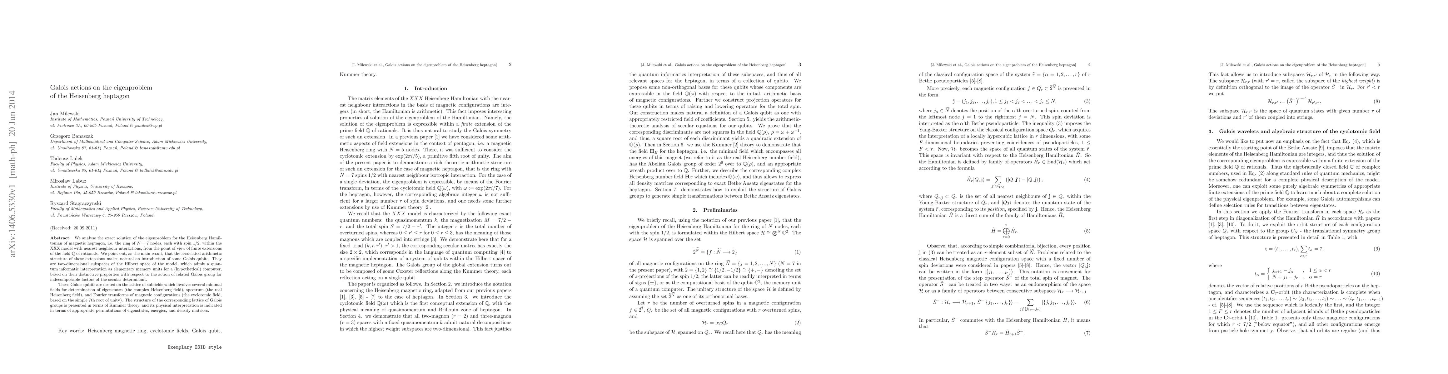 We analyse the exact solution of the eigenproblem for the Heisenberg Hamiltonian of magnetic heptagon, i.e. the ring of N=7 nodes, each with spin 1/2, within the XXX model with nearest neighbour interactions, from the point of view of finite extensions of the field $\mathbb{Q}$ of rationals. We point out, as the main result, that the associated arithmetic structure of these extensions makes natural an introduction of some Galois qubits. They are two-dimensional subspaces of the Hilbert space of the model, which admit a quantum informatic interpretation as elementary memory units for a (hypothetical) computer, based on their distinctive properties with respect to the action of related Galois group for indecomposable factors of the secular determinant. These Galois qubits are nested on the lattice of subfields which involves several minimal fields for determination of eigenstates (the complex Heisenberg field), spectrum (the real Heisenberg field), and Fourier transforms of magnetic configurations (the cyclotomic field, based on the simple 7th root of unity). The structure of the corresponding lattice of Galois groups is presented in terms of Kummer theory, and its physical interpretation is indicated in terms of appropriate permutations of eigenstates, energies, and density matrices.
