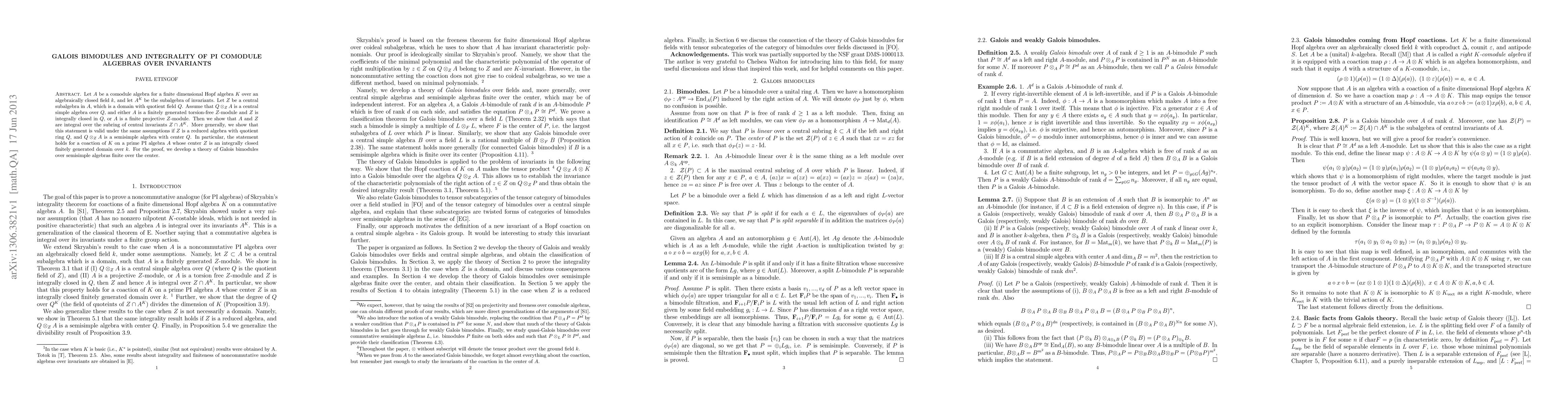 Let A be a comodule algebra for a finite dimensional Hopf algebra K over an algebraically closed field k, and let A^K be the subalgebra of invariants. Let Z be a central subalgebra in A, which is a domain with quotient field Q. Assume that Q\otimes_Z A is a central simple algebra over Q, and either A is a finitely generated torsion-free Z-module and Z is integrally closed in Q, or A is a finite projective Z-module. Then we show that A and Z are integral over the subring of central invariants Z\cap A^K. More generally, we show that this statement is valid under the same assumptions if Z is a reduced algebra with quotient ring Q, and Q\otimes_Z A is a semisimple algebra with center Q. In particular, the statement holds for a coaction of K on a prime PI algebra A whose center Z is an integrally closed finitely generated domain over k. This generalizes the results of S. Skryabin in the case when A is commutative. For the proof, we develop a theory of Galois bimodules over semisimple algebras finite over the center.