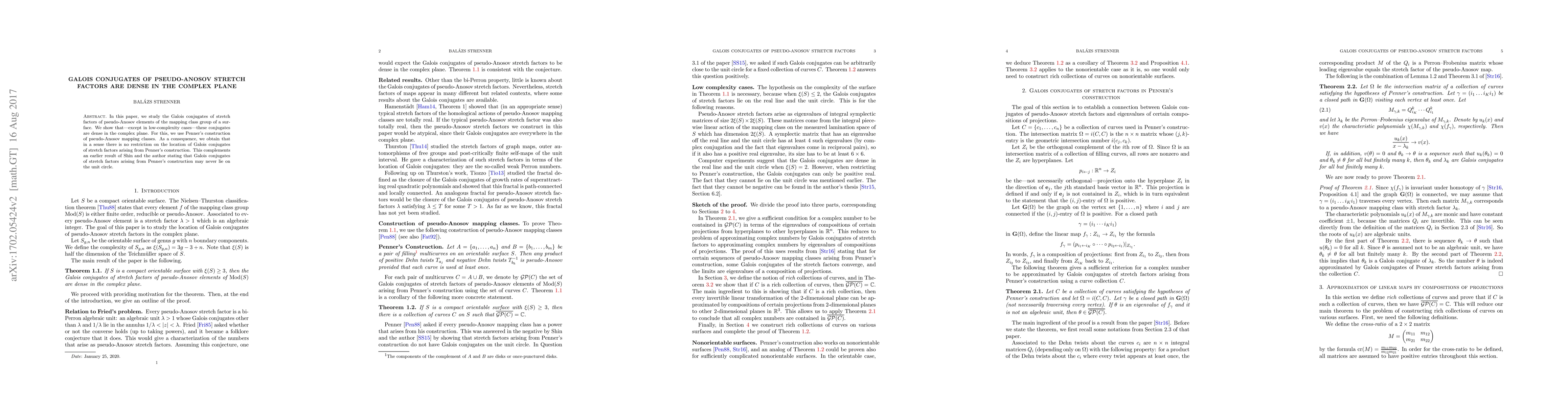 This paper demonstrates that Galois conjugates of pseudo-Anosov stretch factors are dense in the complex plane, except in low-complexity cases, using Penner's construction. It complements a prior result showing these conjugates never lie on the unit circle.