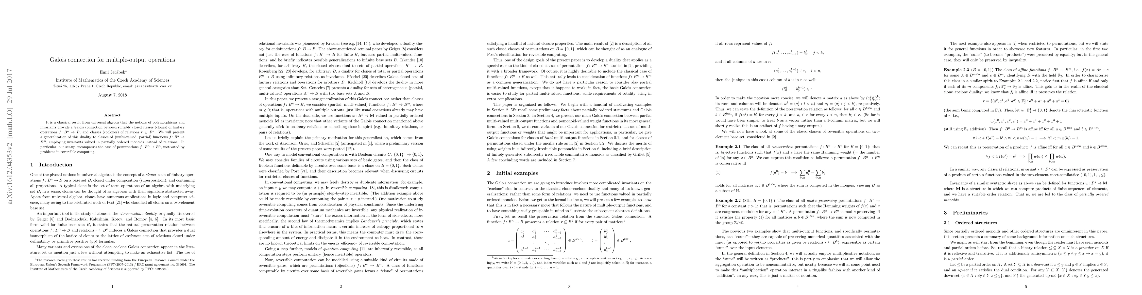 This paper generalizes the classical Galois connection from polymorphisms and invariants to multiple-output operations, using invariants in partially ordered monoids. It specifically addresses multi-valued, partial functions and permutations, with applications to reversible computing.