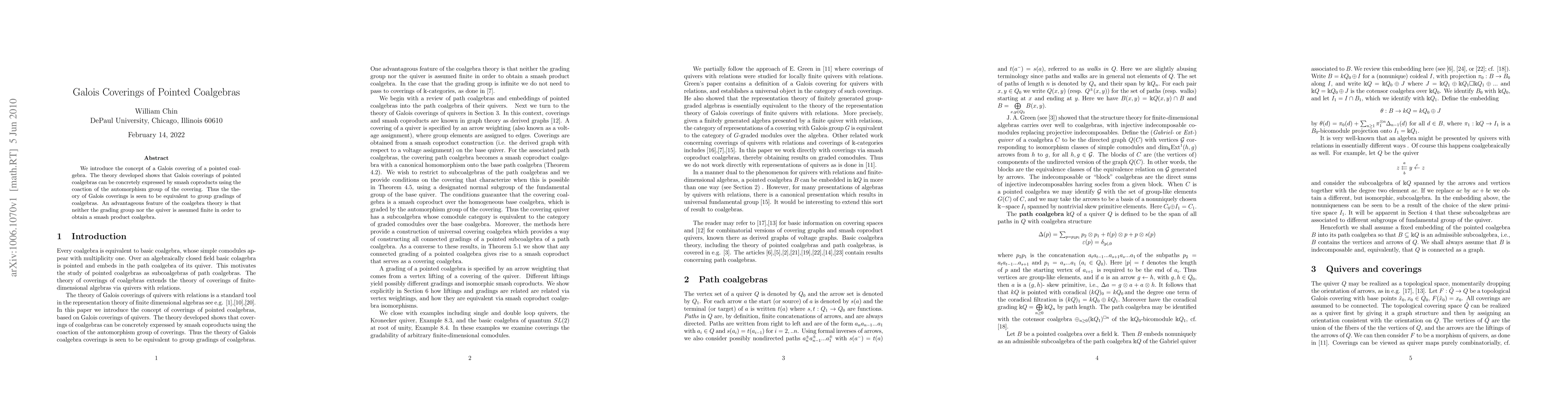 This paper introduces Galois coverings of pointed coalgebras and demonstrates their equivalence to group gradings of coalgebras via smash coproducts using the automorphism group's coaction. Notably, the theory does not require finiteness of the grading group or quiver to construct the smash product coalgebra.