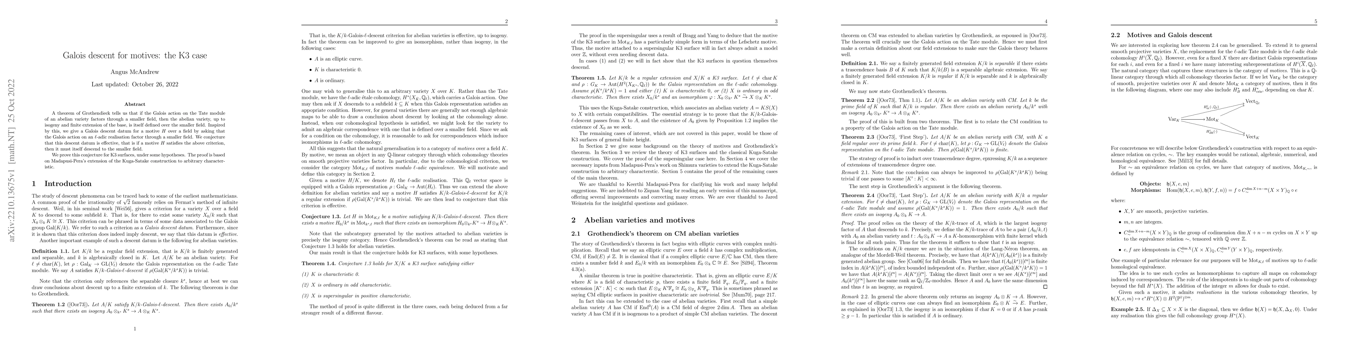 A theorem of Grothendieck tells us that if the Galois action on the Tate module of an abelian variety factors through a smaller field, then the abelian variety, up to isogeny and finite extension of the base, is itself defined over the smaller field. Inspired by this, we give a Galois descent datum for a motive $H$ over a field by asking that the Galois action on an $\ell$-adic realisation factor through a smaller field. We conjecture that this descent datum is effective, that is if a motive $H$ satisfies the above criterion, then it must itself descend to the smaller field. We prove this conjecture for K3 surfaces, under some hypotheses. The proof is based on Madapusi-Pera's extension of the Kuga-Satake construction to arbitrary characteristic.