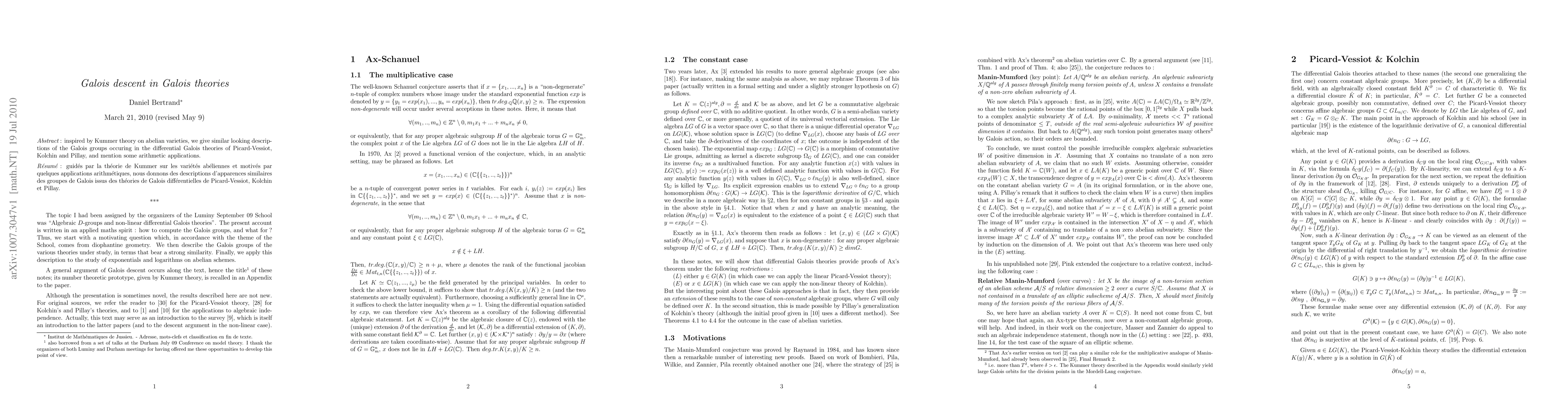 Inspired by Kummer theory on abelian varieties, we give similar looking descriptions of the Galois groups occuring in the differential Galois theories of Picard-Vessiot, Kolchin and Pillay, and mention some arithmetic applications.