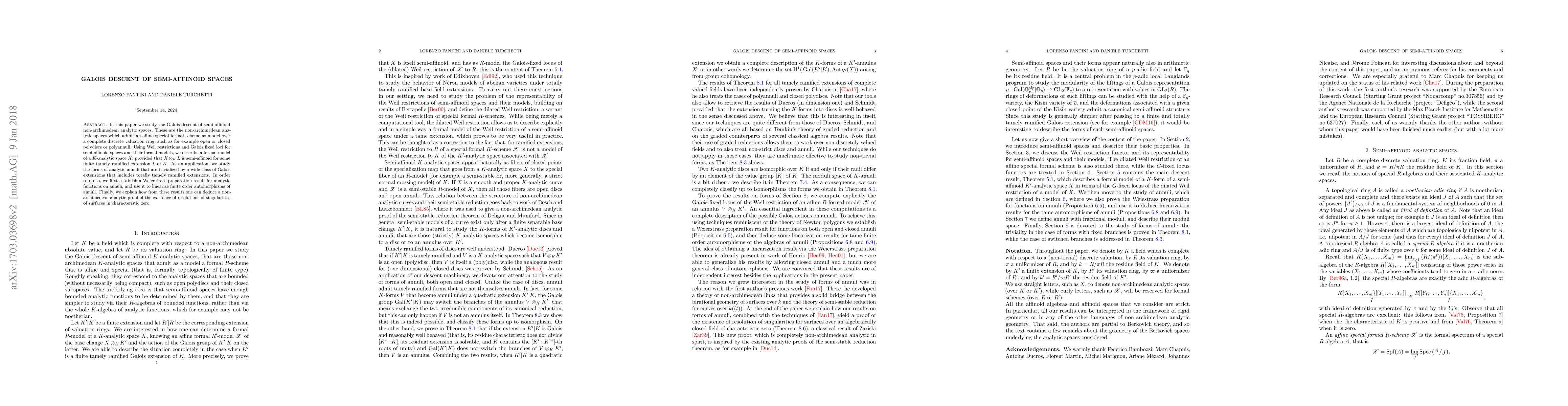 This paper explores Galois descent for semi-affinoid non-archimedean analytic spaces, providing formal models under certain extension conditions and investigating analytic annuli trivialized by Galois extensions. It leverages Weierstrass preparation and finite order automorphisms to prove the existence of resolutions of singularities for surfaces in characteristic zero.