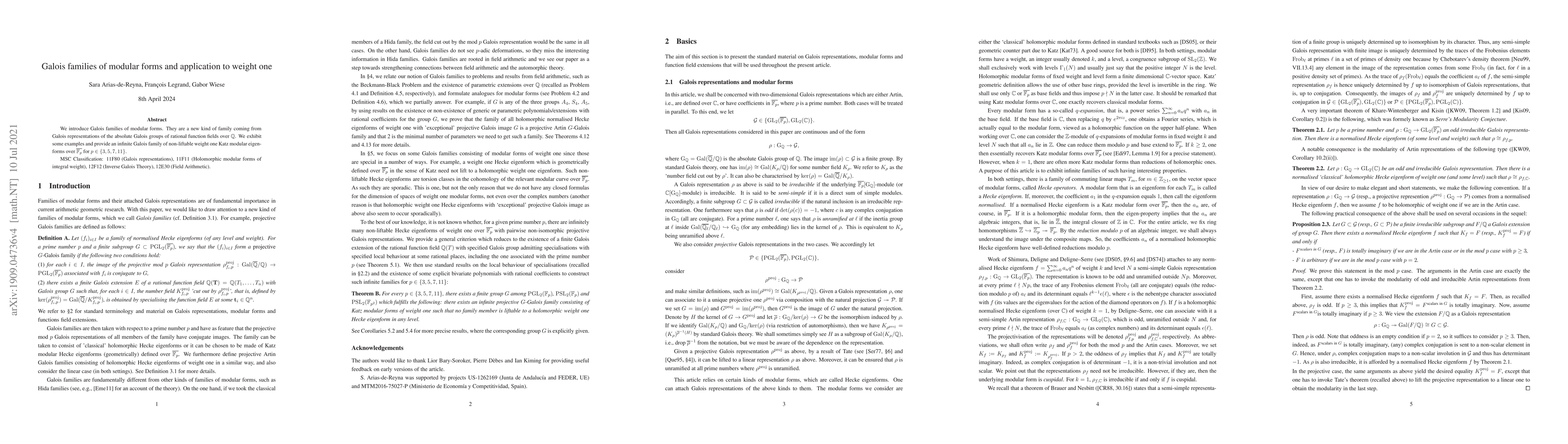 We introduce Galois families of modular forms. They are a new kind of family coming from Galois representations of the absolute Galois groups of rational function fields over the rational field. We exhibit some examples and provide an infinite Galois family of non-liftable weight one Katz modular eigenforms over an algebraic closure of F_p for p in {3,5,7,11}.