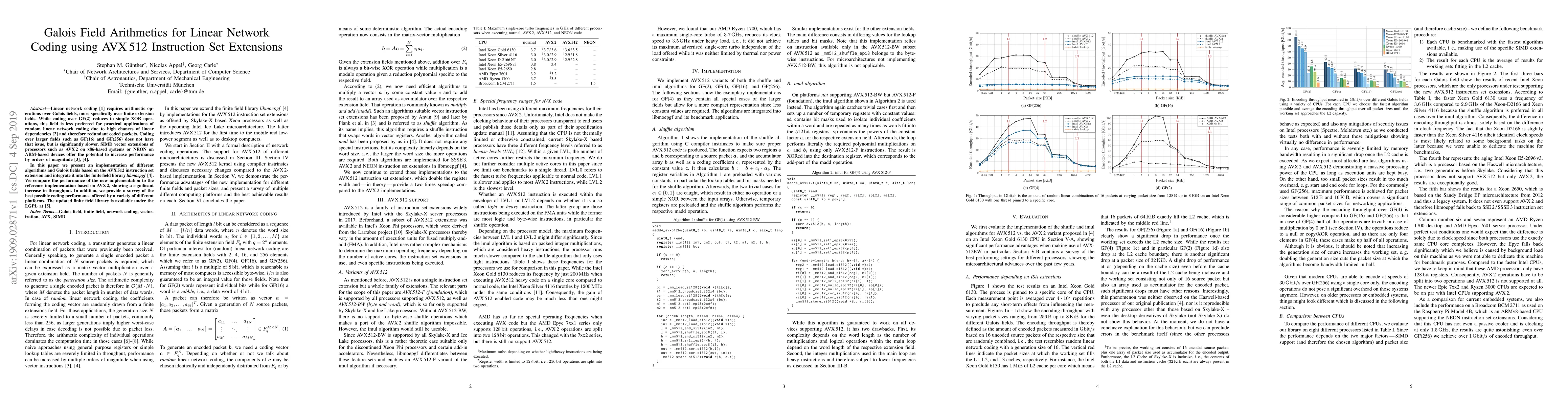 This paper presents an implementation of Galois field arithmetic for linear network coding using AVX512 instruction set extensions, achieving significant performance improvements over the AVX2-based reference implementation. The study integrates these algorithms into the libmoepgf library and surveys the best coding performance across various platforms.