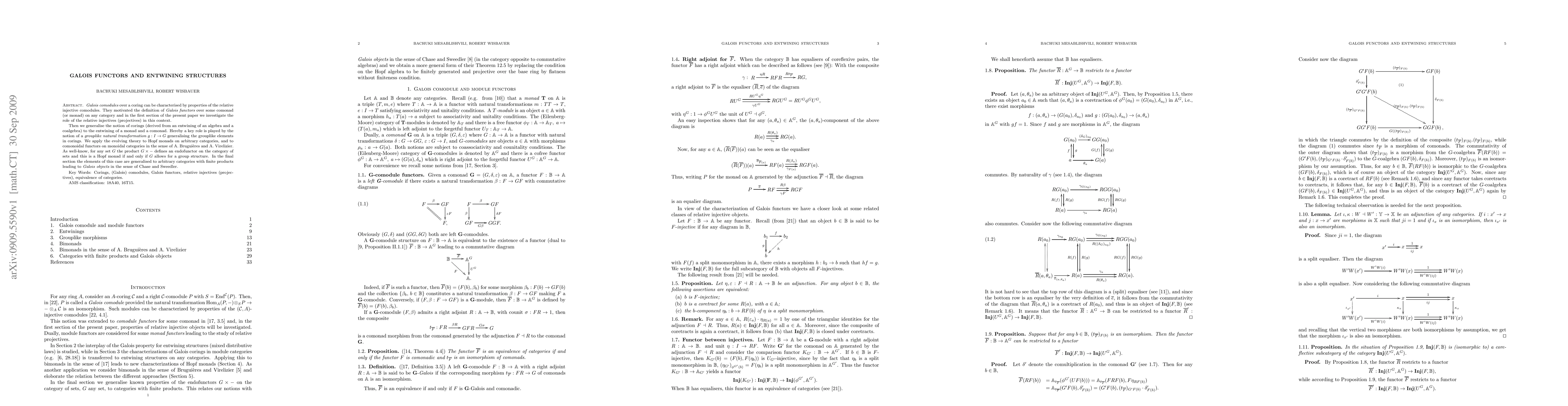 This paper introduces Galois functors and explores their properties in relation to relative injective comodules. It extends the concept of corings to entwining structures between monads and comonads, utilizing grouplike natural transformations, and applies these theories to Hopf monads and comonoidal functors, ultimately generalizing Galois objects in various categories.