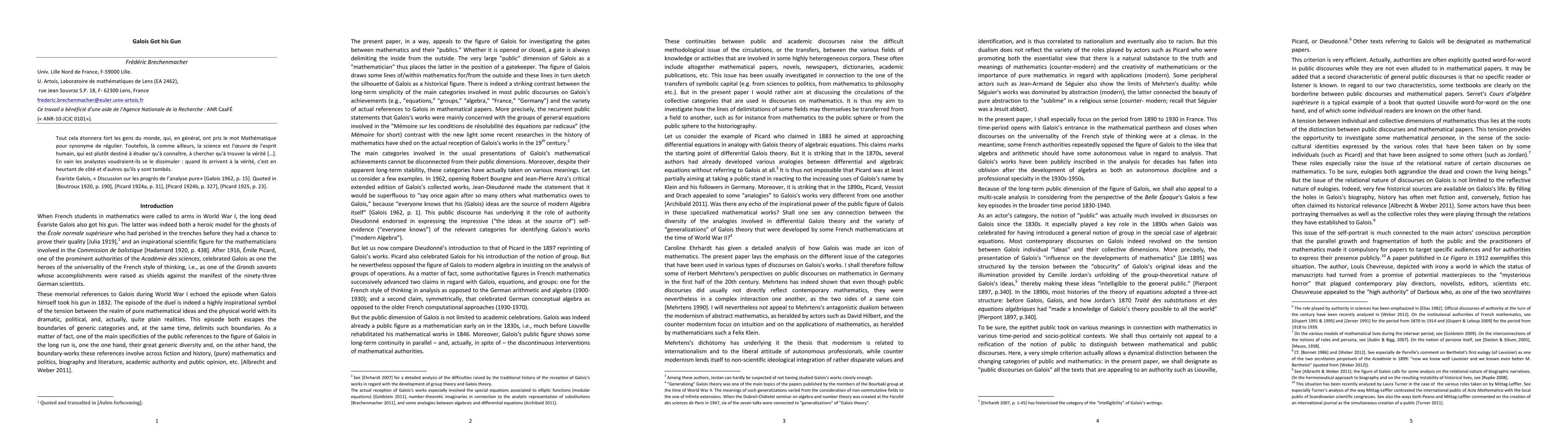 This paper appeals to the figure of \'Evariste Galois for investigating the gates between mathematics and their "publics." The figure of Galois draws some lines of/within mathematics for/from the outside of mathematics and these lines in turn sketch the silhouette of Galois as a historical figure. The present paper especially investigates the collective categories that have been used in various types of public discourses on Galois's work (e.g. equations, groups, algebra, analysis, France, Germany etc.). In a way, this paper aims at shedding light on the boundaries some individuals drew by getting Galois his gun. It is our aim to highlight the roles of authority some individuals (such as as Picard) took on in regard with the public figure of Galois as well as the roles such authorities assigned to other individuals (such as the mediating role assigned to Jordan as a mediator between Galois's "ideas" and the public). The boundary-works involved by most public references to Galois have underlying them a long-term tension between academic and public legitimacies in the definition of some models for mathematical lives (or mathematics personae)