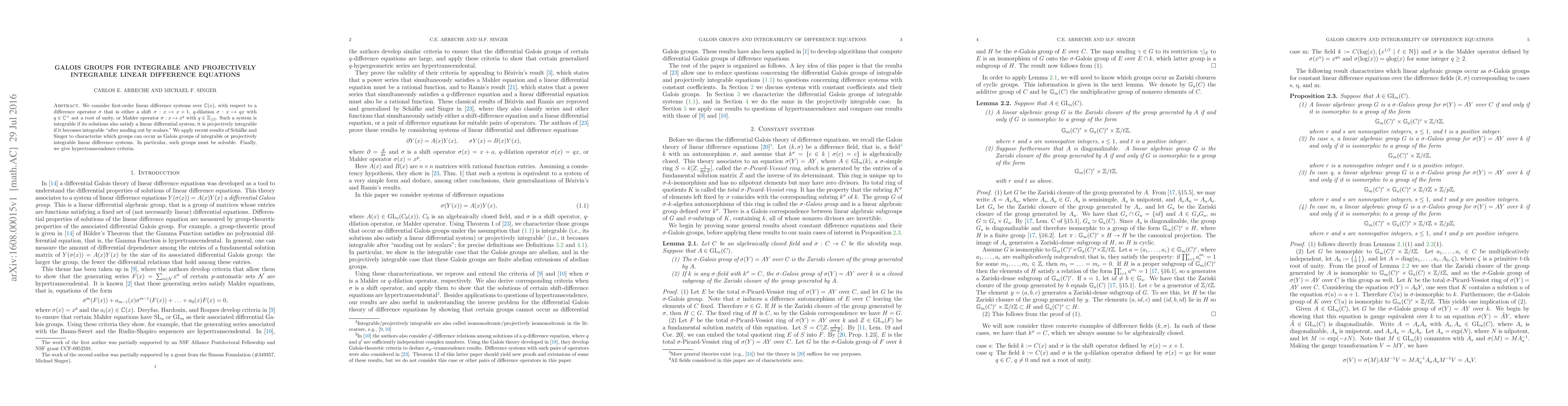 This paper explores first-order linear difference systems over $\mathbb{C}(x)$ under various difference operators, classifying them as integrable or projectively integrable. It characterizes the solvable Galois groups that can arise in these systems, applying recent results to establish hypertranscendence criteria.