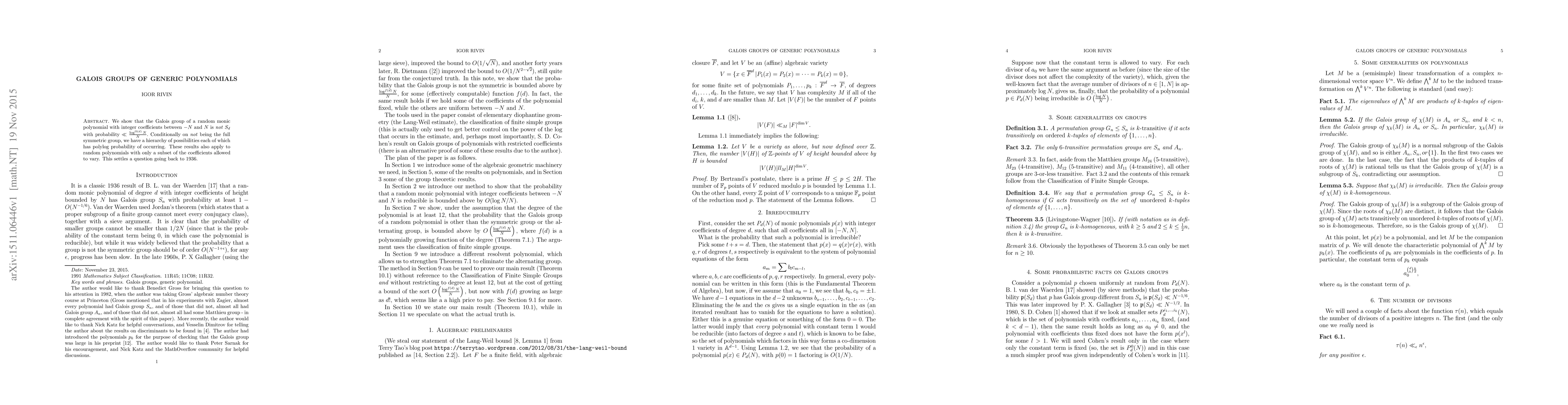 We show that the Galois group of a random monic polynomial %of degree $d>12$ with integer coefficients between $-N$ and $N$ is NOT $S_d$ with probability $\ll \frac{\log^{\Omega(d)}N}{N}.$ Conditionally on NOTbeing the full symmetric group, we have a hierarchy of possibilities each of which has polylog probability of occurring. These results also apply to random polynomials with only a subset of the coefficients allowed to vary. This settles a question going back to 1936.