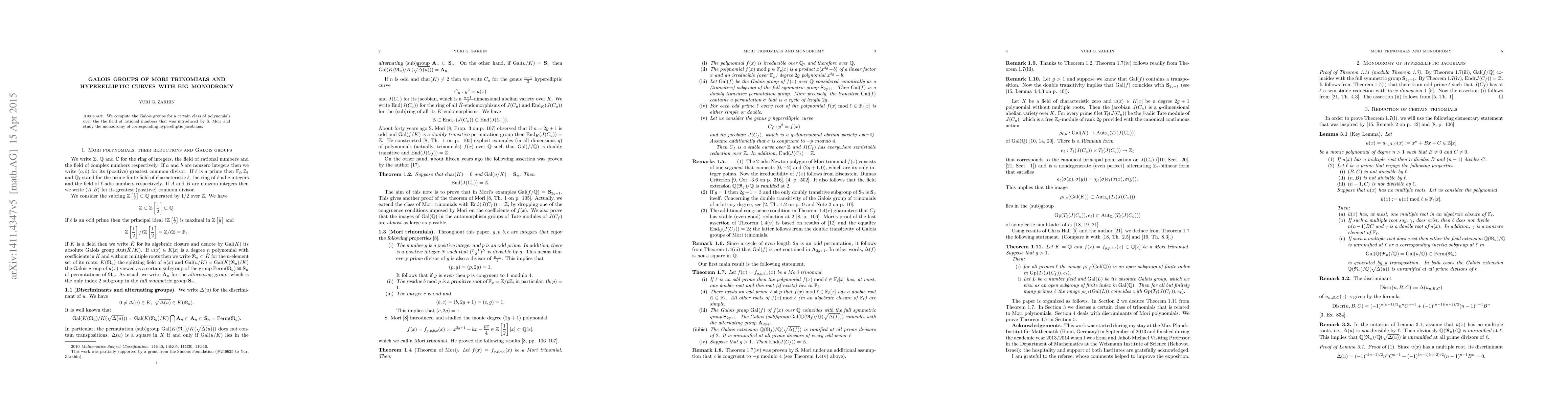 Summary: This paper computes the Galois groups for Mori trinomials over rational numbers and analyzes the monodromy of the associated hyperelliptic Jacobians, focusing on those with large monodromy.