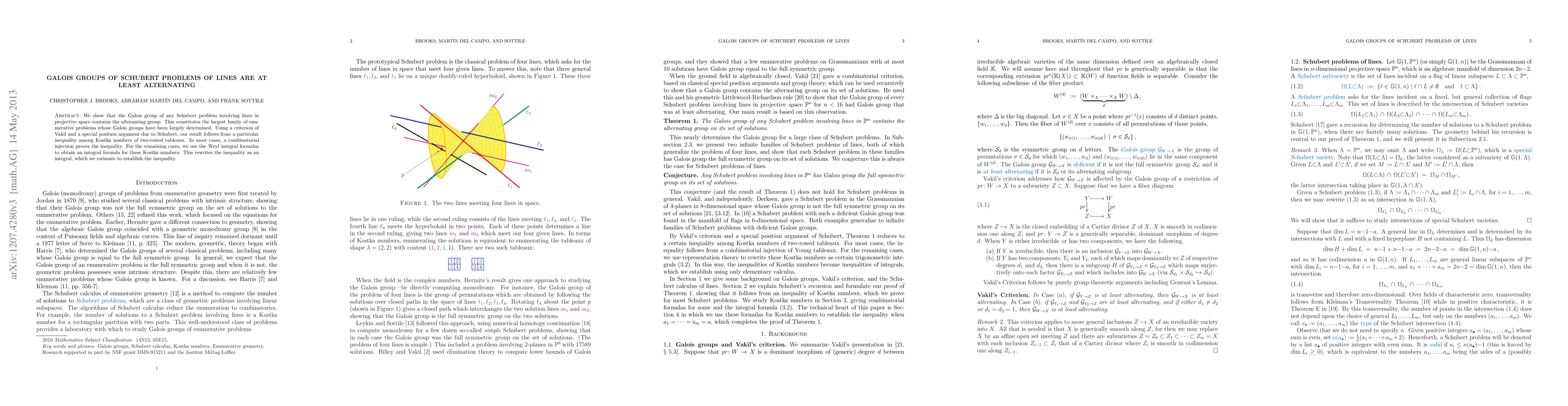 The paper demonstrates that the Galois group of any Schubert problem involving lines in projective space includes the alternating group. This is achieved through a combination of combinatorial techniques and the Weyl integral formula to establish an inequality among Kostka numbers.