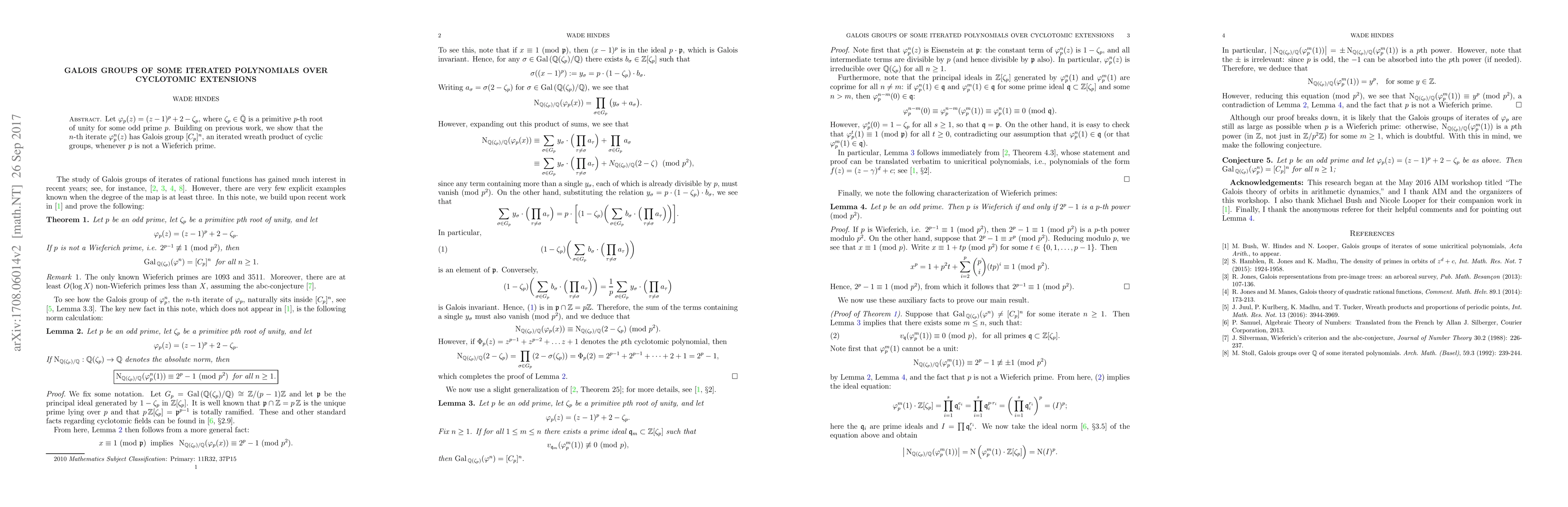 Let $\varphi_p(z)=(z-1)^p+2-\zeta_p$, where $\zeta_p\in\bar{\mathbb{Q}}$ is a primitive $p$-th root of unity for some odd prime $p$. Building on previous work, we show that the $n$-th iterate $\varphi_p^n(z)$ has Galois group $[C_p]^n$, an iterated wreath product of cyclic groups, whenever $p$ is not a Wieferich prime.