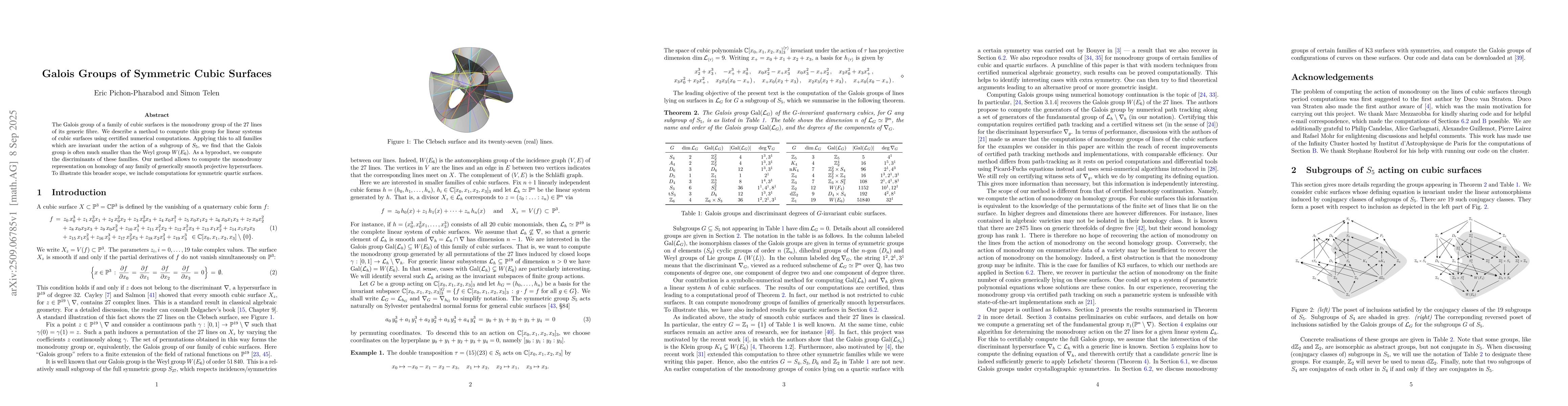The Galois group of a family of cubic surfaces is the monodromy group of the 27 lines of its generic fibre. We describe a method to compute this group for linear systems of cubic surfaces using certified numerical computations. Applying this to all families which are invariant under the action of a subgroup of $S_5$, we find that the Galois group is often much smaller than the Weyl group $W(E_6)$. As a byproduct, we compute the discriminants of these~families. Our method allows to compute the monodromy representation on homology of any family of generically smooth projective hypersurfaces. To illustrate this broader scope, we include computations for symmetric quartic surfaces.