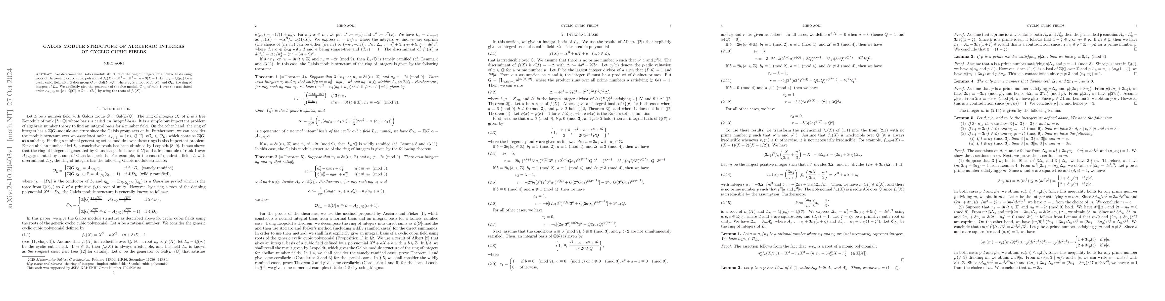 We determine the Galois module structure of the ring of integers for all cubic fields using roots of the generic cyclic cubic polynomial $f_n(X)=X^3-nX^2-(n+3)X-1$. Let $L_n=\mathbb Q(\rho_n)$ be a cyclic cubic field with Galois group $G:={\rm Gal}(L_n/\mathbb Q)$, where $\rho_n$ is a root of $f_n (X)$, and ${\mathcal O}_{L_n}$ the ring of integers of $L_n$. We explicitly give the generator of the free module ${\mathcal O}_{L_n}$ of rank $1$ over the associated order ${\mathcal A}_{L_n/\mathbb Q}:= \{ x\in \mathbb Q [G] \, |\, x\, {\mathcal O}_L \subset {\mathcal O}_L \}$ by using the roots of $f_n(X)$.