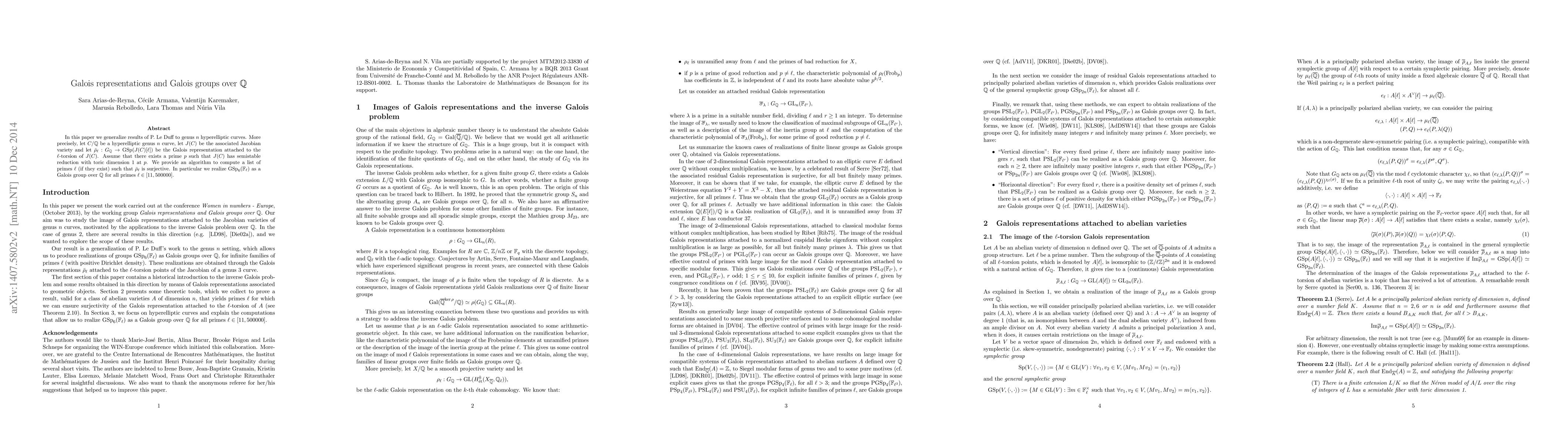 In this paper we generalize results of P. Le Duff to genus n hyperelliptic curves. More precisely, let C/Q be a hyperelliptic genus n curve and let J(C) be the associated Jacobian variety. Assume that there exists a prime p such that J(C) has semistable reduction with toric dimension 1 at p. We provide an algorithm to compute a list of primes l (if they exist) such that the Galois representation attached to the l-torsion of J(C) is surjective onto the group GSp(2n, l). In particular we realize GSp(6, l) as a Galois group over Q for all primes l in [11, 500000].