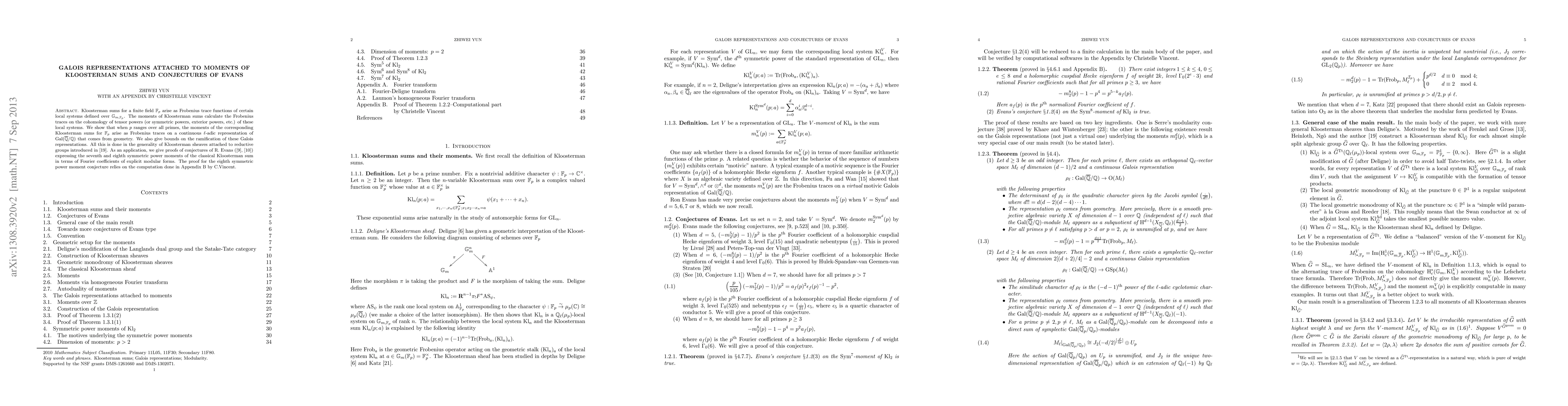 This paper establishes a connection between moments of Kloosterman sums over finite fields and $\ell$-adic Galois representations arising from geometry, providing bounds on their ramification. It also proves conjectures by R. Evans relating these moments to Fourier coefficients of modular forms.