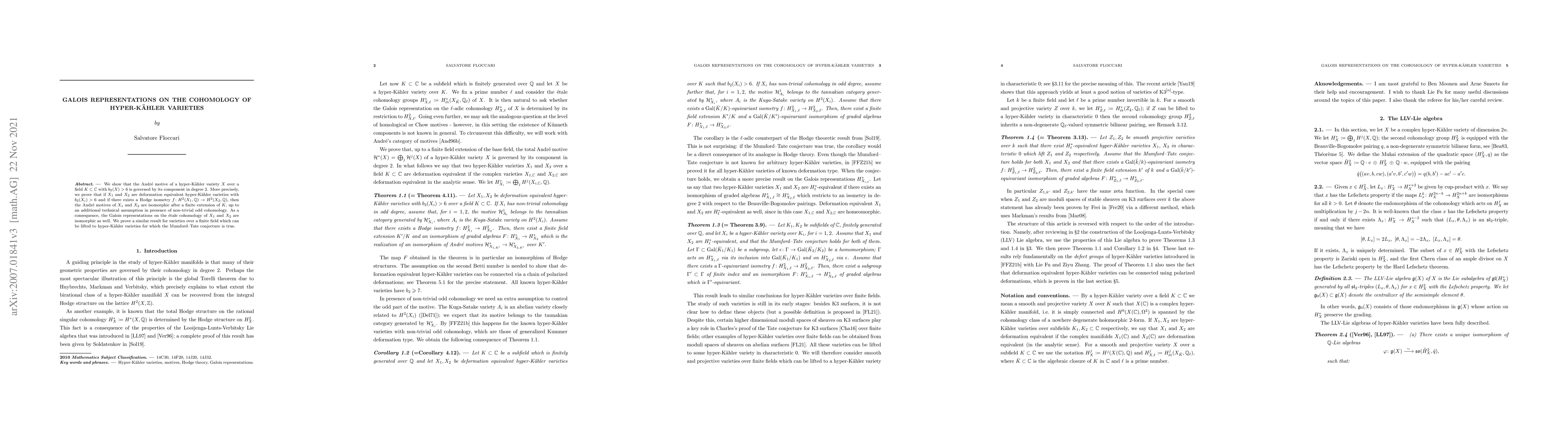 This paper establishes that for deformation equivalent hyper-Kähler varieties with second Betti number greater than six, their André motives are isomorphic after a finite field extension, provided a Hodge isometry exists between their second cohomology groups. The study also extends to Galois representations on the étale cohomology, showing their isomorphism under the same conditions.