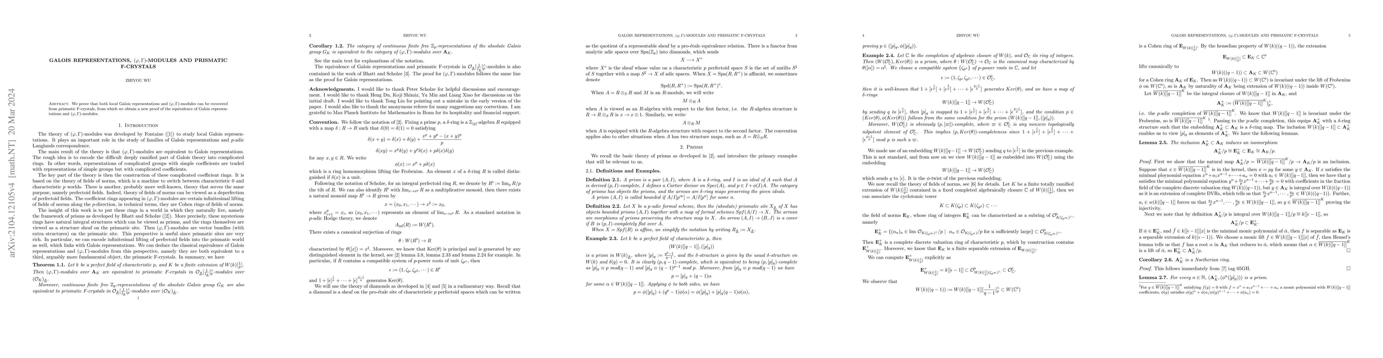 This paper establishes that both local Galois representations and $(\varphi, \Gamma)$-modules can be derived from prismatic F-crystals, providing a novel proof for the equivalence between these two mathematical structures.