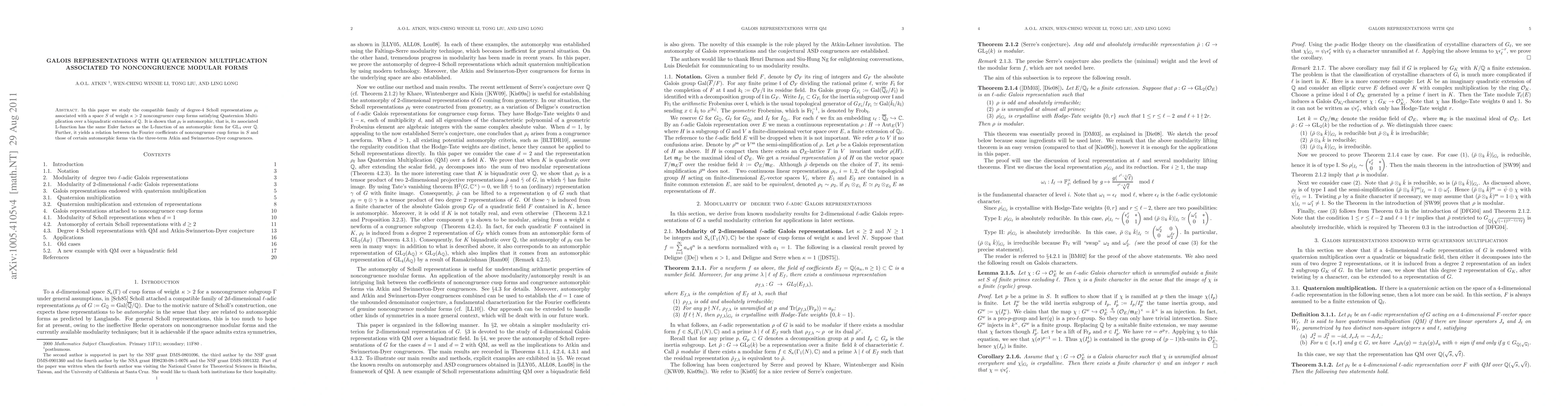 In this paper we study the compatible family of degree-4 Scholl representations $\rho_{\ell}$ associated with a space $S$ of weight $\kappa> 2$ noncongruence cusp forms satisfying Quaternion Multiplications over a biquadratic field $K$. It is shown that when either $K$ is totally real or $\kappa$ is odd, $\rho_\ell$ is automorphic, that is, its associated L-function has the same Euler factors as the L-function of an automorphic form for $GL_4(\mathbb Q)$. Further, it yields a relation between the Fourier coefficients of noncongruence cusp forms in $S$ and those of certain automorphic forms via the three-term Atkin and Swinnerton-Dyer congruences.