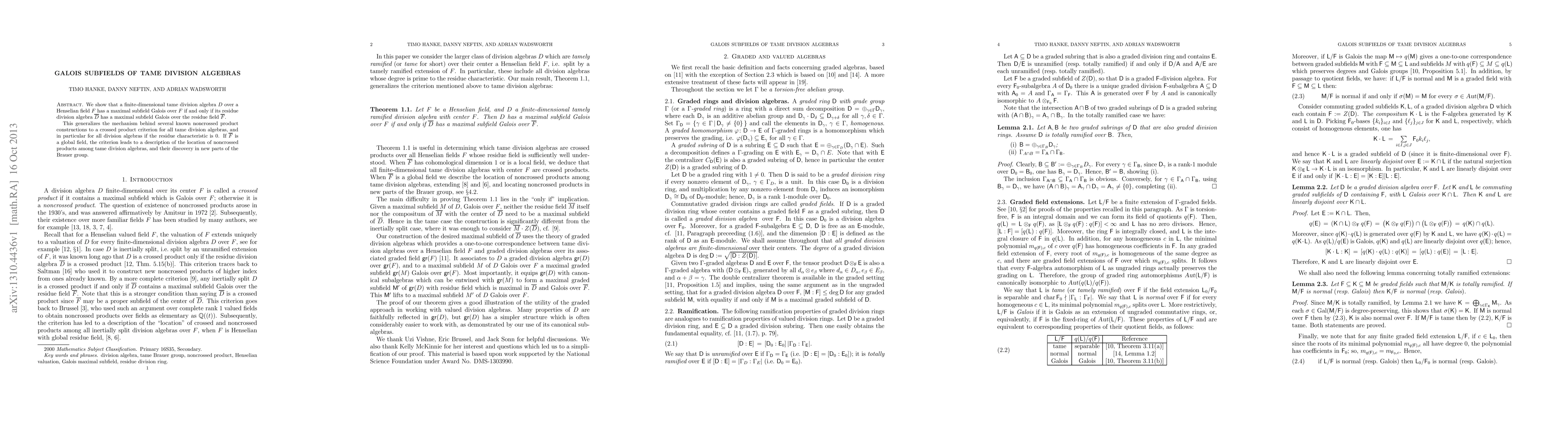 We show that a finite-dimensional tame division algebra D over a Henselian field F has a maximal subfield Galois over F if and only if its residue division algebra has a maximal subfield Galois over the residue field of F. This generalizes the mechanism behind several known noncrossed product constructions to a crossed product criterion for all tame division algebras, and in particular for all division algebras if the residue characteristic is 0. If the residue field is a global field, the criterion leads to a description of the location of noncrossed products among tame division algebras, and their discovery in new parts of the Brauer group.