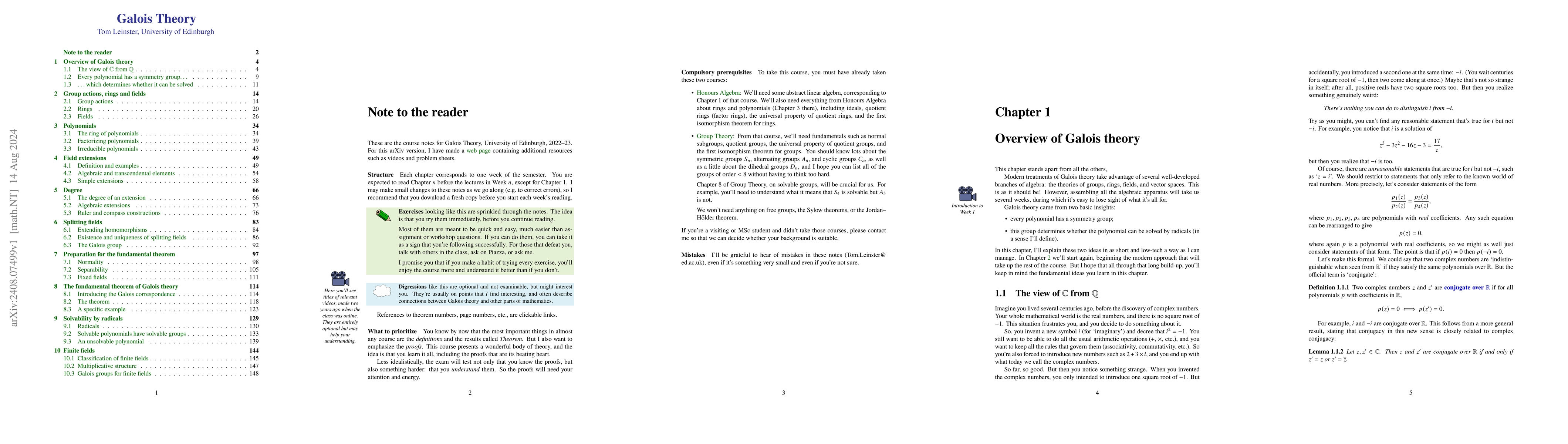 Summary: These notes introduce Galois theory, focusing on field extensions and Galois groups, culminating in the fundamental theorem. They also cover ruler and compass constructions, solvability of polynomials, and classification of finite fields. Prerequisites include basic ring, group, and linear algebra knowledge.