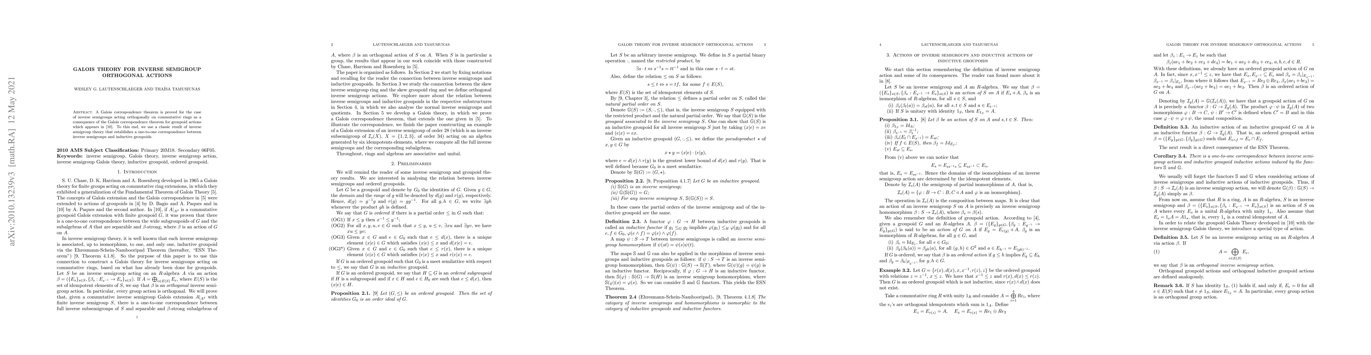 This paper establishes a Galois correspondence for inverse semigroups acting orthogonally on commutative rings, extending the classical Galois correspondence for groupoid actions, leveraging the known correspondence between inverse semigroups and inductive groupoids.