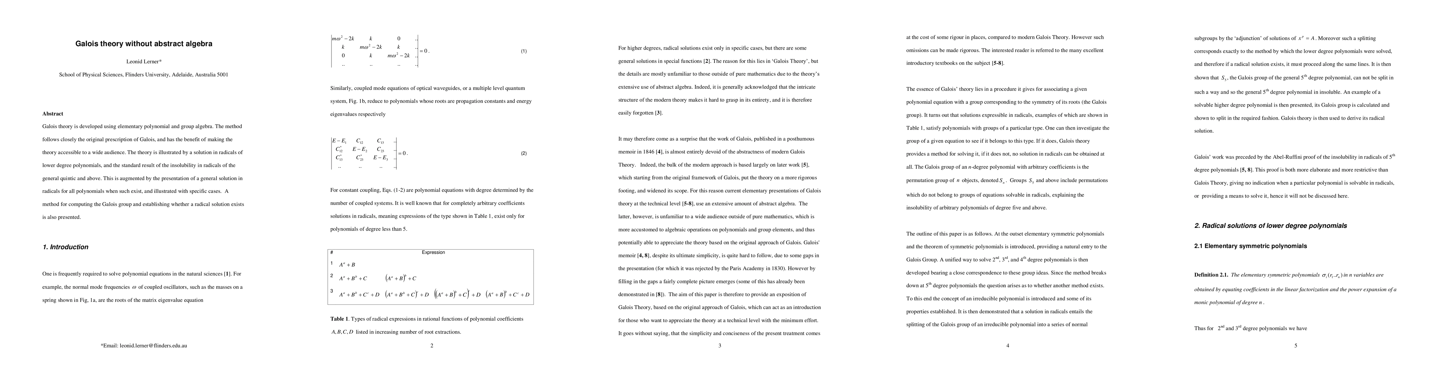 Galois theory is developed using elementary polynomial and group algebra. The method follows closely the original prescription of Galois, and has the benefit of making the theory accessible to a wide audience. The theory is illustrated by a solution in radicals of lower degree polynomials, and the standard result of the insolubility in radicals of the general quintic and above. This is augmented by the presentation of a general solution in radicals for all polynomials when such exist, and illustrated with specific cases. A method for computing the Galois group and establishing whether a radical solution exists is also presented.