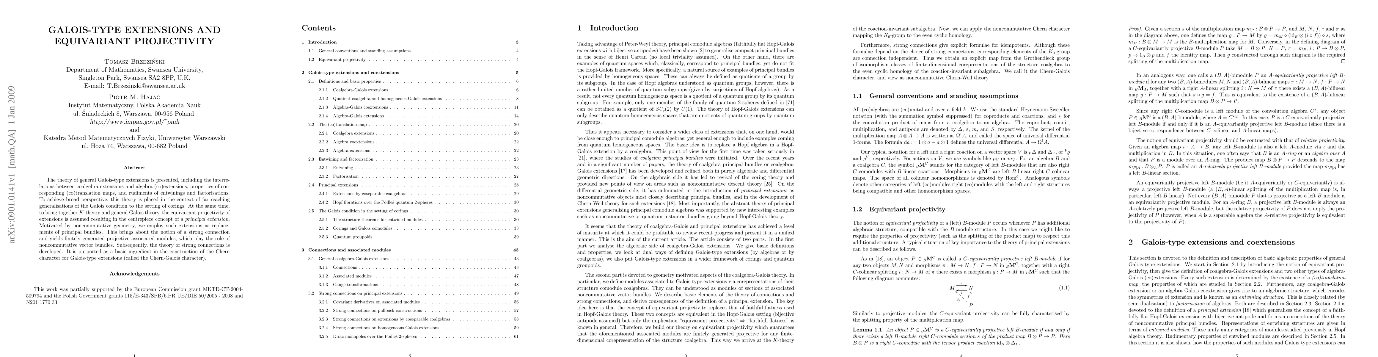 The theory of general Galois-type extensions is presented, including the interrelations between coalgebra extensions and algebra (co)extensions, properties of corresponding (co)translation maps, and rudiments of entwinings and factorisations. To achieve broad perspective, this theory is placed in the context of far reaching generalisations of the Galois condition to the setting of corings. At the same time, to bring together K-theory and general Galois theory, the equivariant projectivity of extensions is assumed resulting in the centrepiece concept of a principal extension. Motivated by noncommutative geometry, we employ such extensions as replacements of principal bundles. This brings about the notion of a strong connection and yields finitely generated projective associated modules, which play the role of noncommutative vector bundles. Subsequently, the theory of strong connections is developed. It is purported as a basic ingredient in the construction of the Chern character for Galois-type extensions (called the Chern-Galois character).