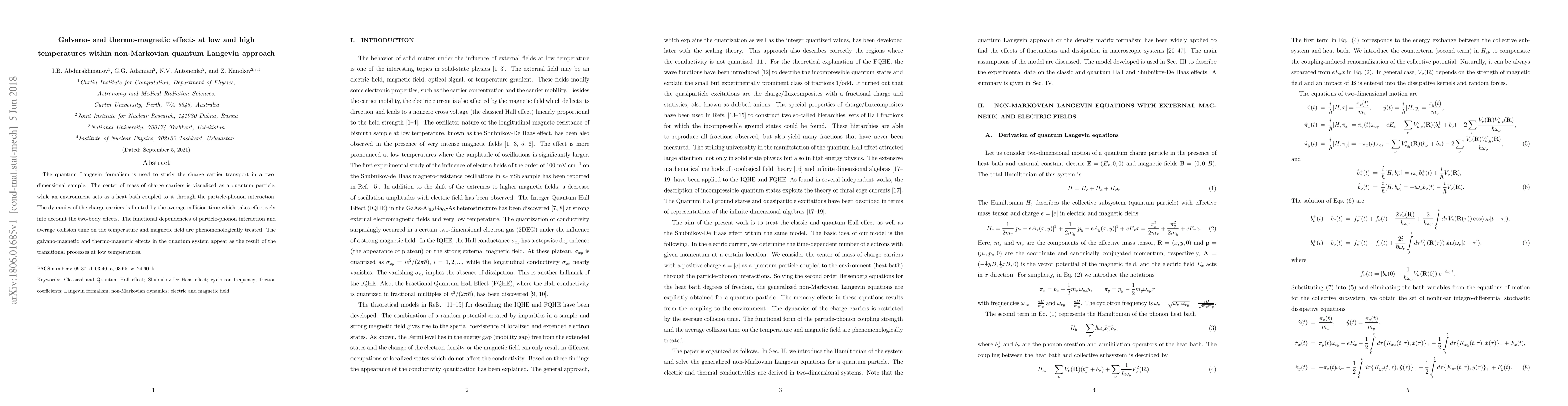 The quantum Langevin formalism is used to study the charge carrier transport in a twodimensional sample. The center of mass of charge carriers is visualized as a quantum particle, while an environment acts as a heat bath coupled to it through the particle-phonon interaction. The dynamics of the charge carriers is limited by the average collision time which takes effectively into account the two-body effects. The functional dependencies of particle-phonon interaction and average collision time on the temperature and magnetic field are phenomenologically treated. The galvano-magnetic and thermo-magnetic effects in the quantum system appear as the result of the transitional processes at low temperatures.
