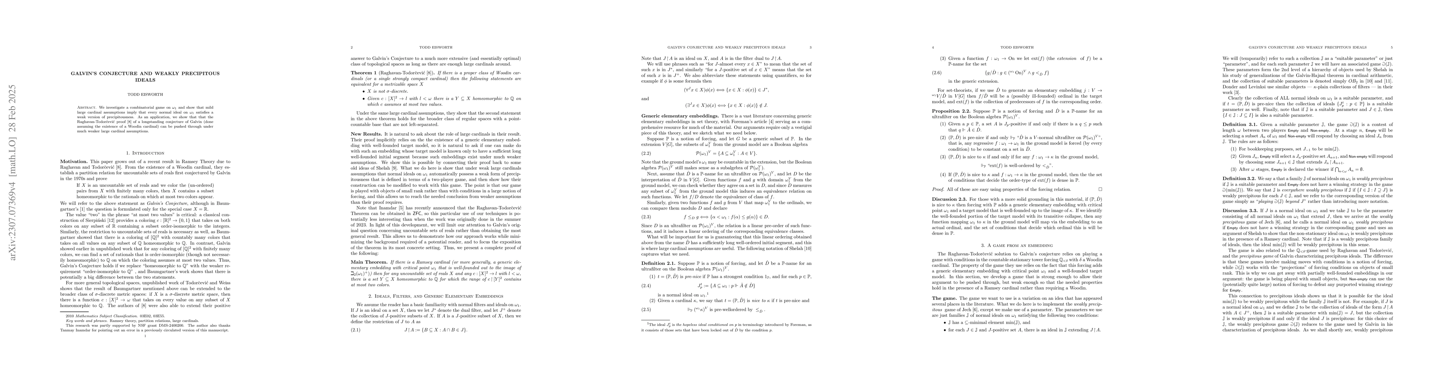 We show that if $\kappa$ is a Ramsey cardinal then every fine countably complete normal ideal concentrating on a set in $V_\kappa$ (hence every normal ideal on $\omega_1$) satisfies a weak form of precipitousness. As an application we show that Ramsey cardinals can be used instead of Woodin cardinals and stationary tower forcing to push through the Raghavan-Todor\v{c}evi\'{c} proof\cite{dilipstevo} of a longstanding conjecture of Galvin: if a Ramsey cardinal exists then for any uncountable set of reals $X$ and any coloring $c$ of $[X]^2$ with finitely many colors, there is a subspace of $X$ homeomorphic to the rationals on which $c$ takes on at most two colors. Finally, we use work of Donder and Levinsky\cite{donder} to show that this partition theorem for uncountable sets of reals can hold in a generic extension of G\"{o}del's $L$, and therefore does not imply the existence of~$0^\sharp$.