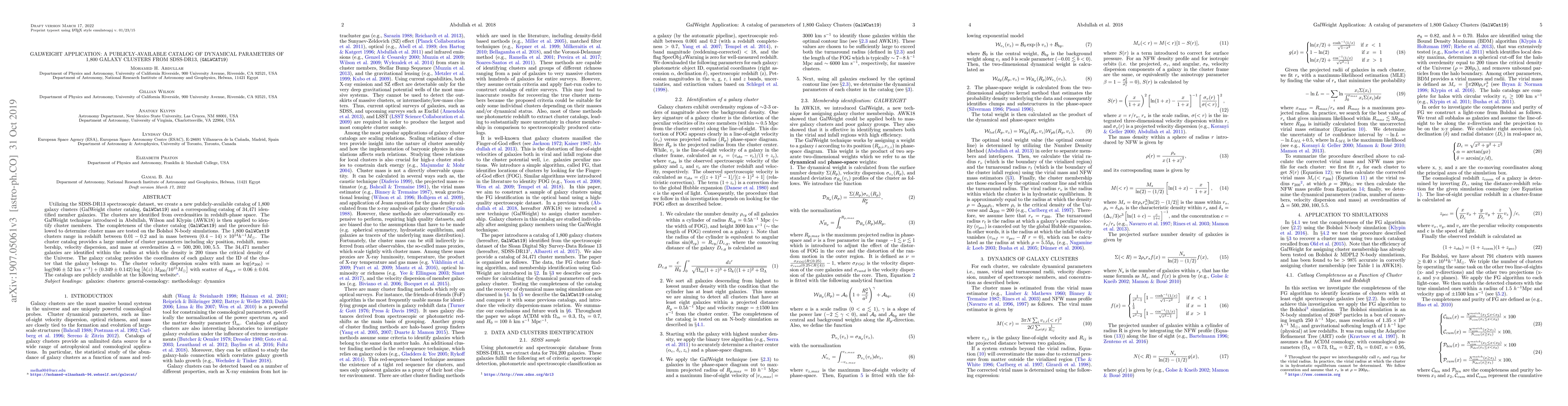 The paper presents the $\mathtt{GalWCat19}$ catalog, a new publicly-available dataset of 1,800 galaxy clusters from SDSS-DR13, identified using the GalWeight technique and accompanied by a catalog of 34,471 member galaxies. The clusters' mass ranges from $(0.4 - 14) \times 10^{14}h^{-1}M_{\odot}$ and are tested against Bolshoi N-body simulations.