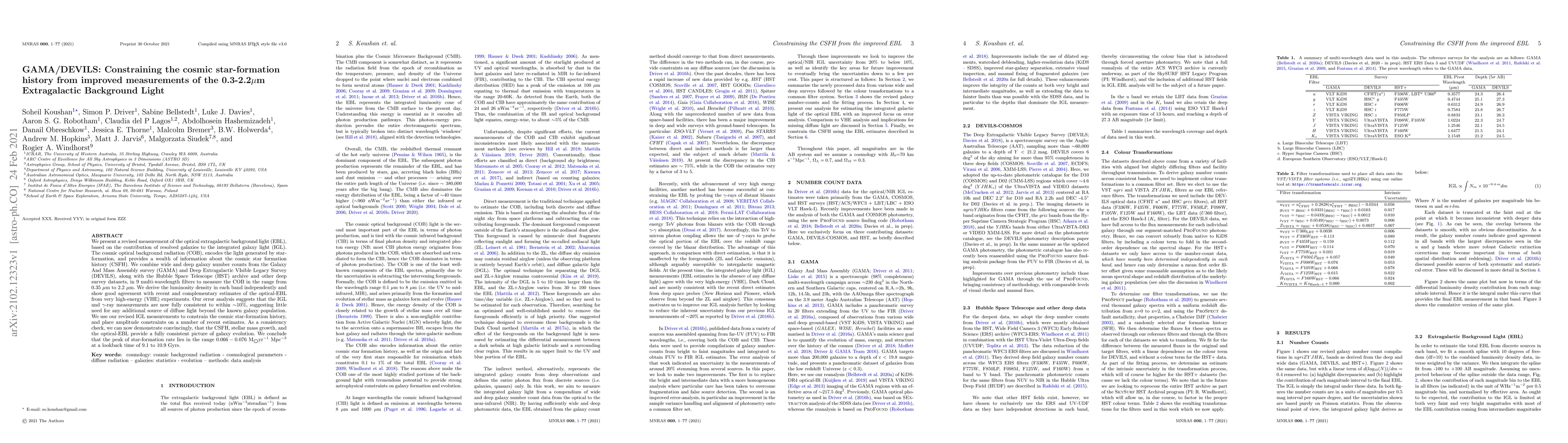 This paper revises the optical extragalactic background light (EBL) measurement using data from GAMA, DEVILS, and HST, finding good agreement with VHE experiments. The study constrains the cosmic star-formation history, concluding that the peak star-formation rate occurred 9.1 to 10.9 Gyrs ago at a rate of 0.066-0.076 Msol/yr/Mpc^3.