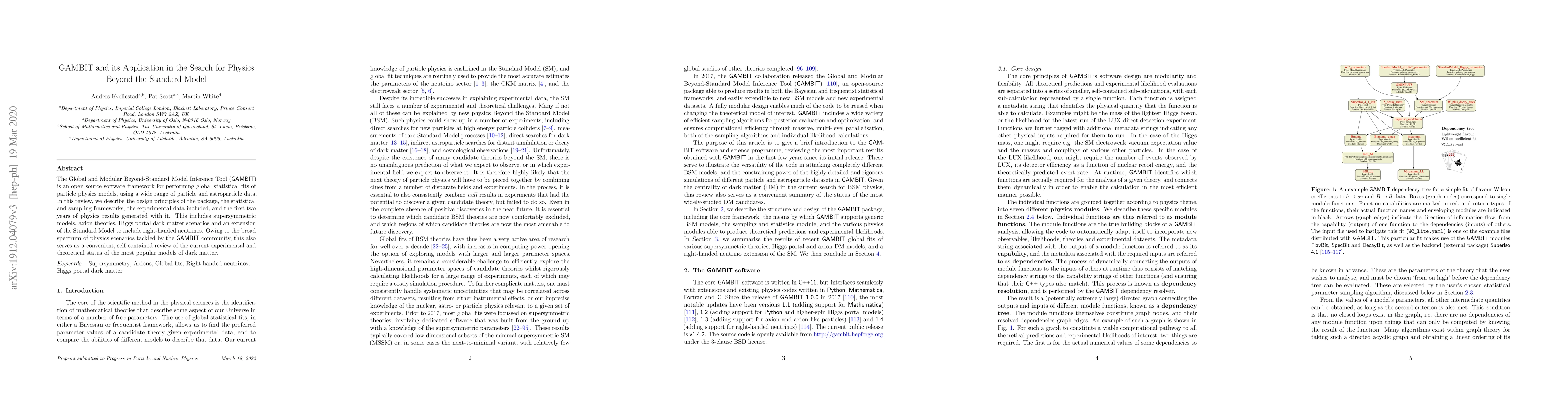The Global and Modular Beyond-Standard Model Inference Tool (GAMBIT) is an open source software framework for performing global statistical fits of particle physics models, using a wide range of particle and astroparticle data. In this review, we describe the design principles of the package, the statistical and sampling frameworks, the experimental data included, and the first two years of physics results generated with it. This includes supersymmetric models, axion theories, Higgs portal dark matter scenarios and an extension of the Standard Model to include right-handed neutrinos. Owing to the broad spectrum of physics scenarios tackled by the GAMBIT community, this also serves as a convenient, self-contained review of the current experimental and theoretical status of the most popular models of dark matter.