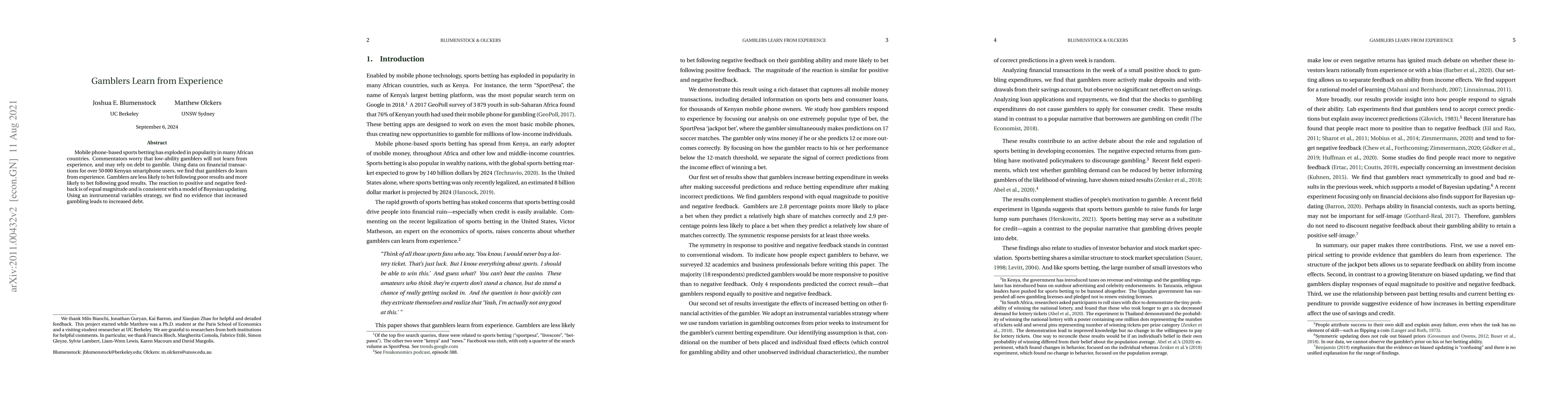 Gamblers in Kenya learn from their experiences, avoiding poor results and increasing bets after good ones. Increased gambling does not lead to increased debt, according to a study of 50,000 smartphone users.