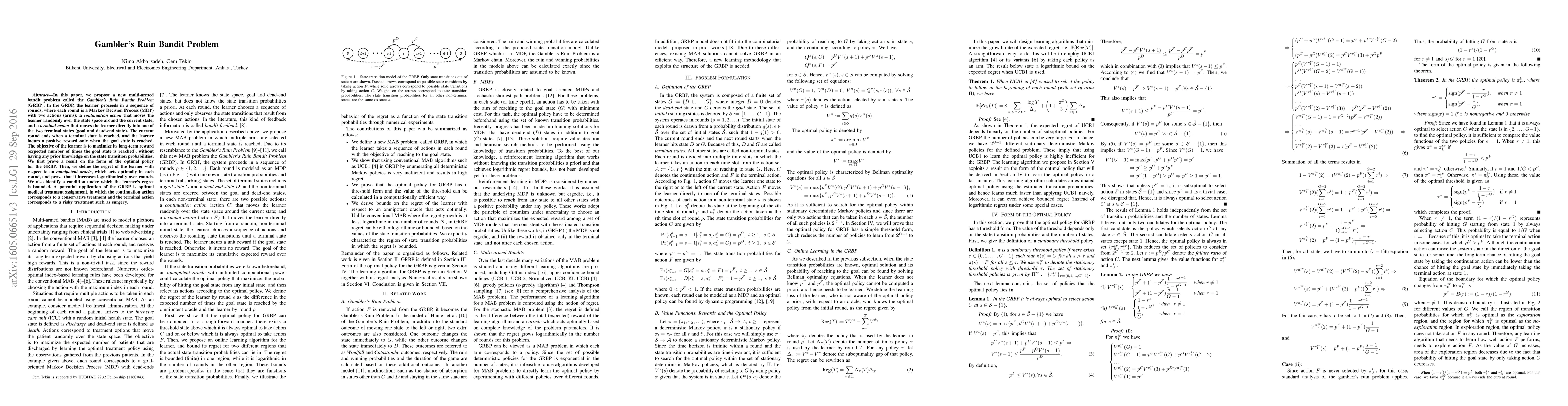 Researchers propose a new multi-armed bandit problem called Gambler's Ruin Bandit Problem, where the goal is to maximize long-term reward without prior knowledge of state transition probabilities, and find that the learner's regret increases logarithmically over rounds.