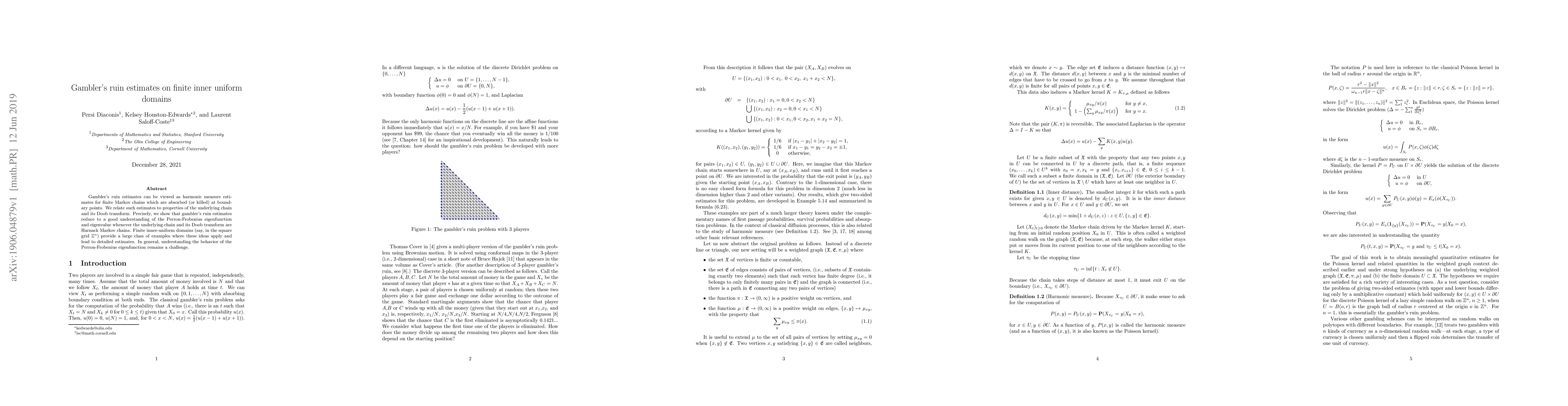 Research finds that gambler's ruin estimates can be understood through the Perron-Frobenius eigenfunction for Harnack Markov chains on finite inner-uniform domains like the square grid.