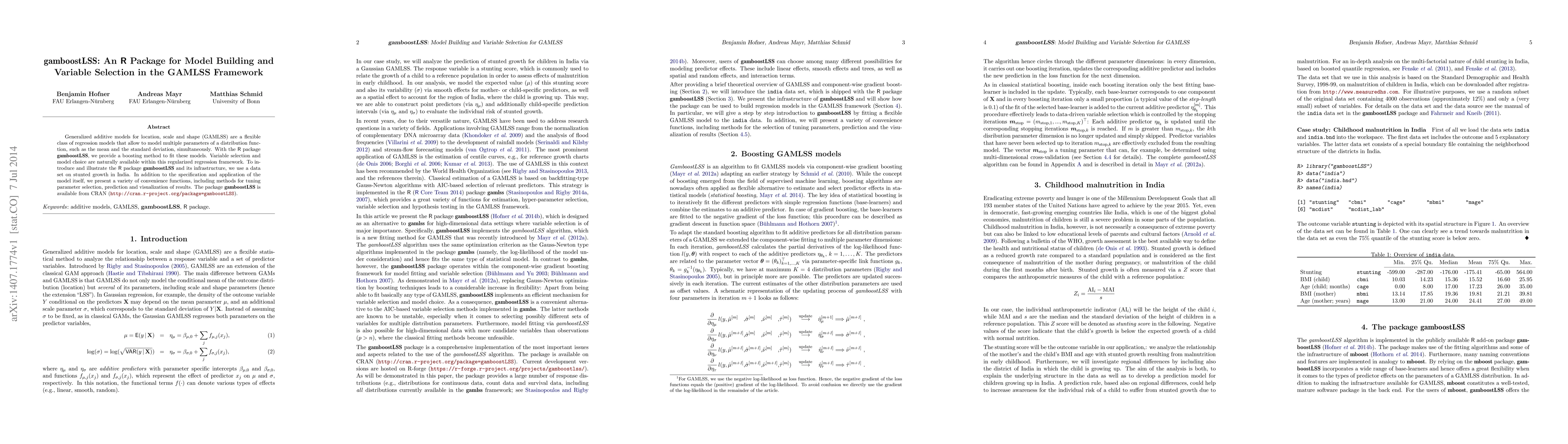 The R package gamboostLSS offers a boosting method for fitting Generalized Additive Models for Location, Scale, and Shape (GAMLSS), allowing for flexible modeling of multiple distribution parameters. It includes variable selection and model choice features, demonstrated through an application on stunted growth data in India, with additional functions for parameter tuning and result visualization.