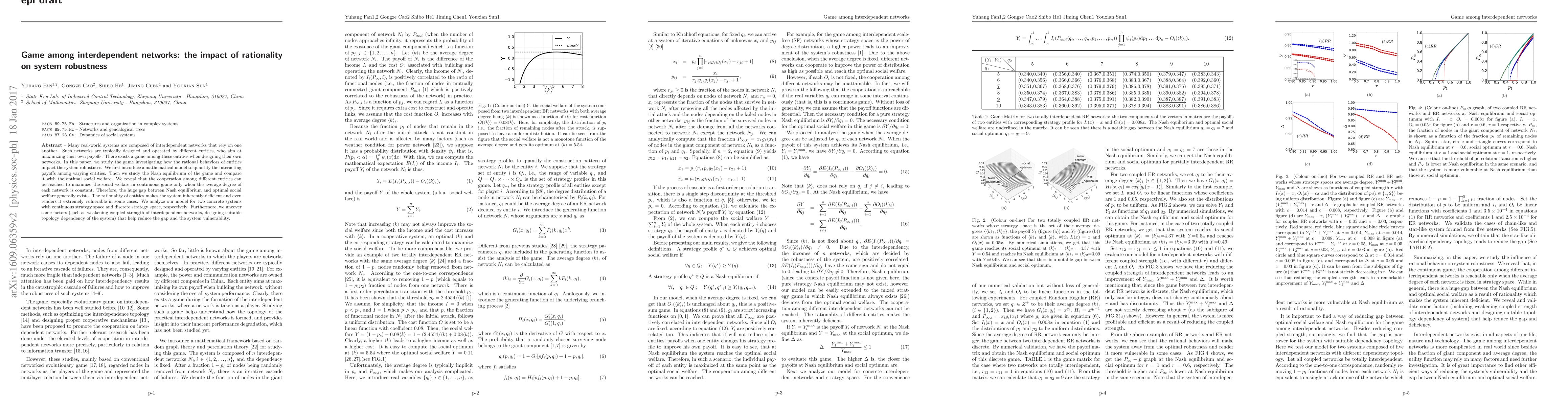 Many real-world systems are composed of interdependent networks that rely on one another. Such networks are typically designed and operated by different entities, who aim at maximizing their own payoffs. There exists a game among these entities when designing their own networks. In this paper, we study the game investigating how the rational behaviors of entities impact the system robustness. We first introduce a mathematical model to quantify the interacting payoffs among varying entities. Then we study the Nash equilibrium of the game and compare it with the optimal social welfare. We reveal that the cooperation among different entities can be reached to maximize the social welfare in continuous game only when the average degree of each network is constant. Therefore, the huge gap between Nash equilibrium and optimal social welfare generally exists. The rationality of entities makes the system inherently deficient and even renders it extremely vulnerable in some cases. We analyze our model for two concrete systems with continuous strategy space and discrete strategy space, respectively. Furthermore, we uncover some factors (such as weakening coupled strength of interdependent networks, designing suitable topology dependency of the system) that help reduce the gap and the system vulnerability.