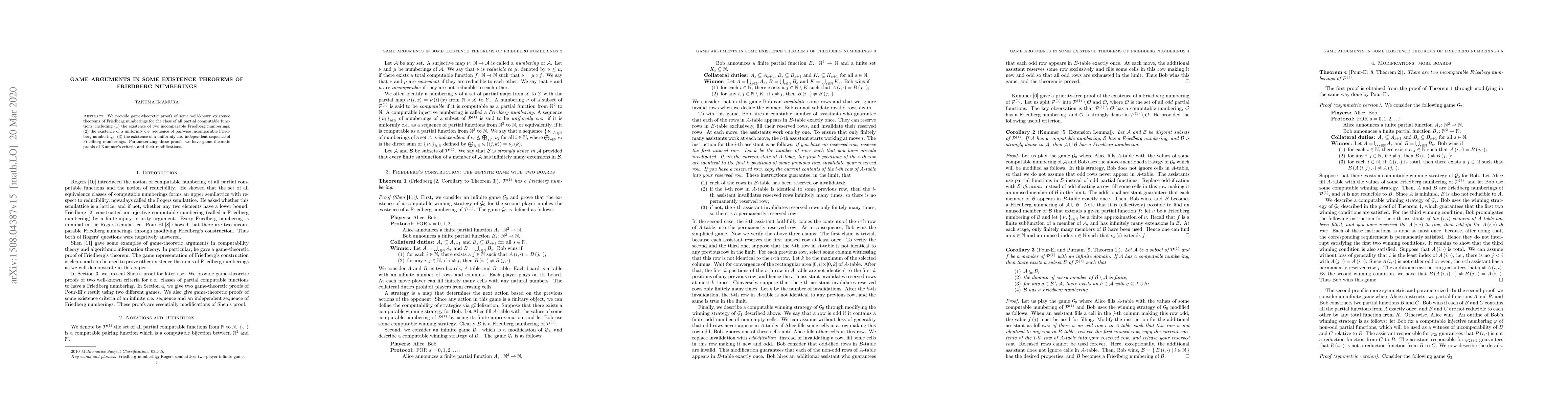We provide game-theoretic proofs of some well-known existence theorems of Friedberg numberings for the class of all partial computable functions, including (1) the existence of two incomparable Friedberg numberings; (2) the existence of a uniformly c.e. sequence of pairwise incomparable Friedberg numberings; (3) the existence of a uniformly c.e. independent sequence of Friedberg numberings. Parameterizing these proofs, we have game-theoretic proofs of Kummer's criteria and their modifications.