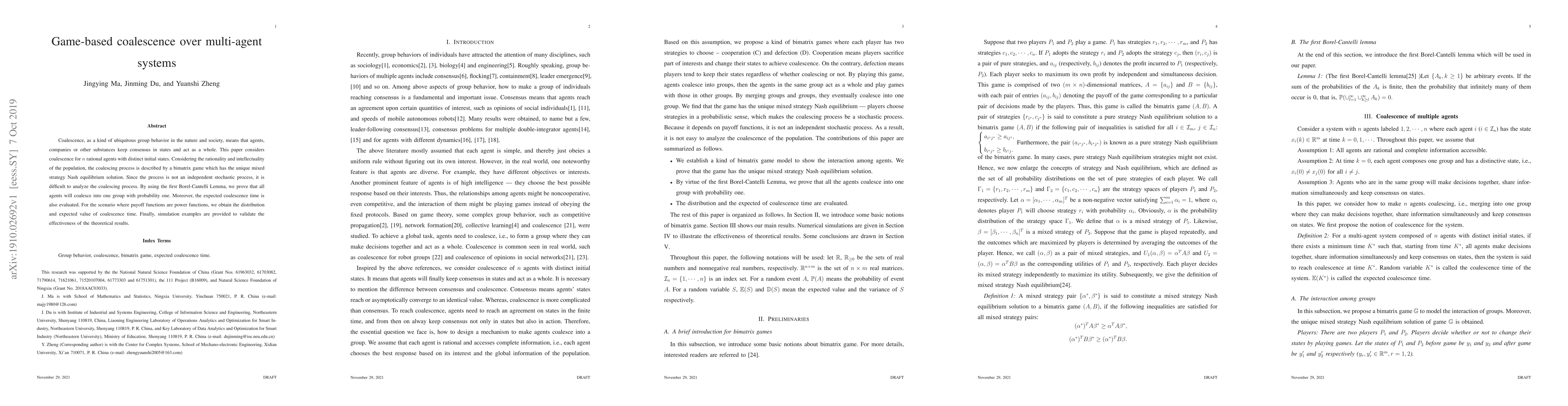 Coalescence, as a kind of ubiquitous group behavior in the nature and society, means that agents, companies or other substances keep consensus in states and act as a whole. This paper considers coalescence for n rational agents with distinct initial states. Considering the rationality and intellectuality of the population, the coalescing process is described by a bimatrix game which has the unique mixed strategy Nash equilibrium solution. Since the process is not an independent stochastic process, it is difficult to analyze the coalescing process. By using the first Borel-Cantelli Lemma, we prove that all agents will coalesce into one group with probability one. Moreover, the expected coalescence time is also evaluated. For the scenario where payoff functions are power functions, we obtain the distribution and expected value of coalescence time. Finally, simulation examples are provided to validate the effectiveness of the theoretical results.