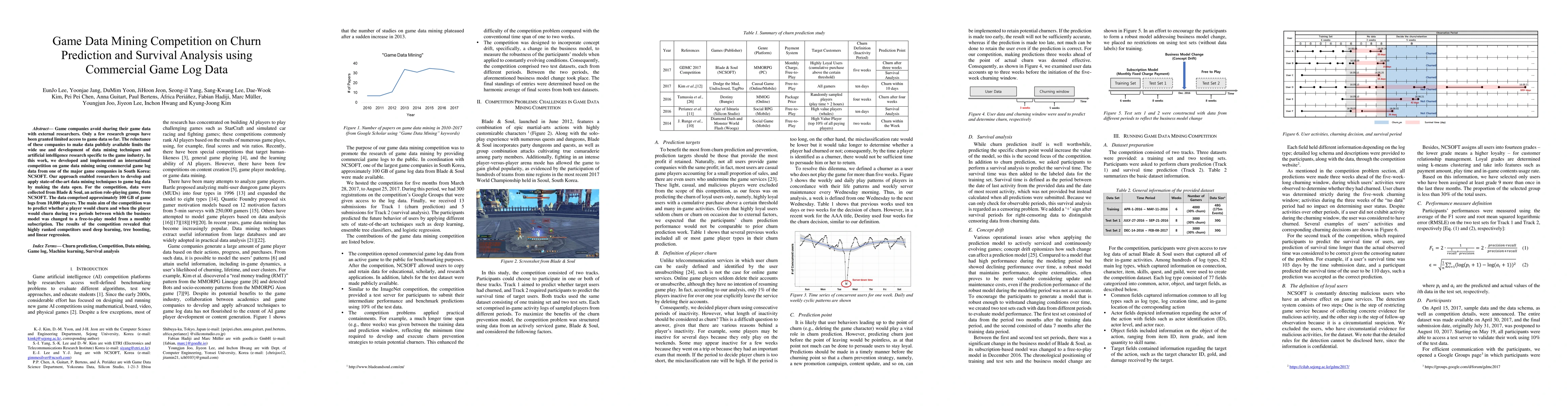 This paper details an international competition on game data mining using commercial game log data from NCSOFT, focusing on churn prediction and survival analysis. The competition aimed to predict player churn before and after a business model change, revealing successful methods included deep learning, tree boosting, and linear regression.