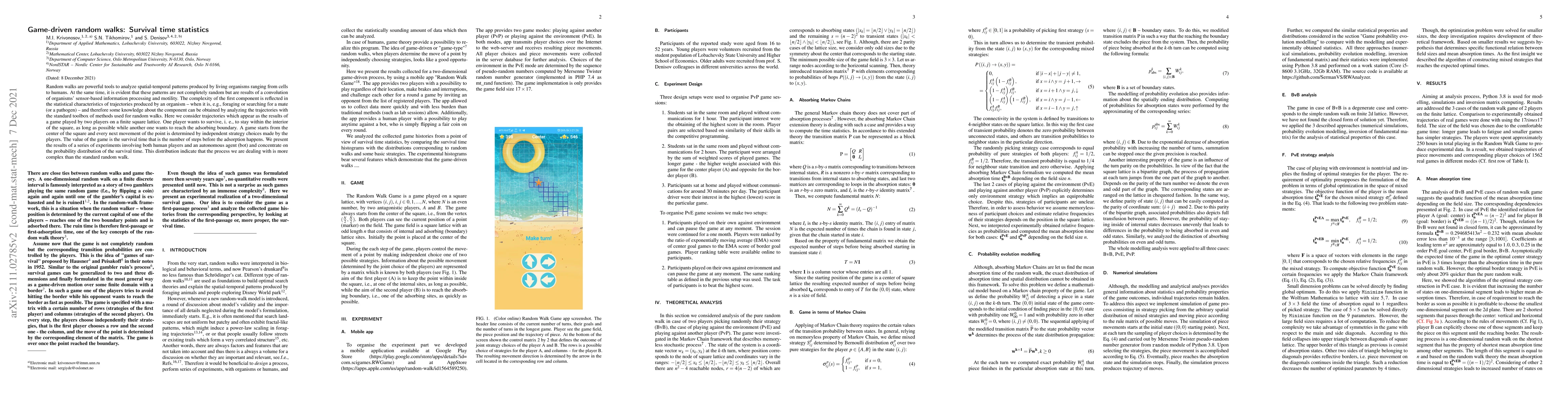 Random walks are powerful tools to analyze spatial-temporal patterns produced by living organisms ranging from cells to humans. At the same time, it is evident that these patterns are not completely random but are results of a convolution of organisms' sensor-based information processing and motility. The complexity of the first component is reflected in the statistical characteristics of trajectories produced by an organism -- when it is, e.g., foraging or searching for a mate (or a pathogen) -- and therefore some knowledge about the component can be obtained by analyzing the trajectories with the standard toolbox of methods used for random walks. Here we consider trajectories which appear as the results of a game played by two players on a finite square lattice. One player wants to survive, i. e., to stay within the interior of the square, as long as possible while another one wants to reach the adsorbing boundary. A game starts from the center of the square and every next movement of the point is determined by independent strategy choices made by the players. The value of the game is the survival time that is the number of steps before the adsorption happens. We present the results of a series of experiments involving both human players and an autonomous agent (bot) and concentrate on the probability distribution of the survival time. This distribution indicate that the process we are dealing with is more complex than the standard random walks.