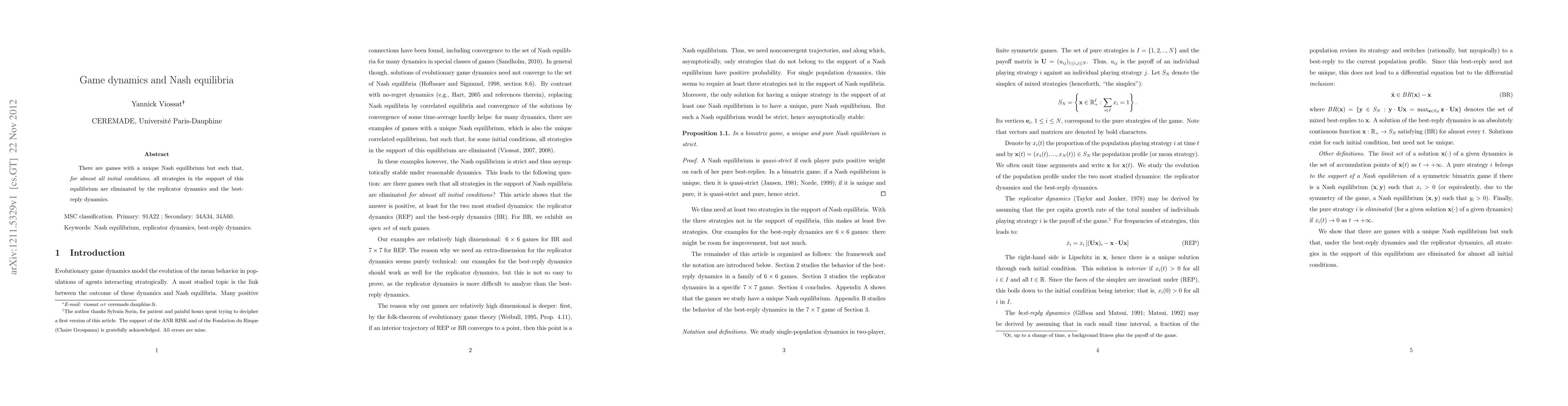This paper explores the dynamics of game strategies under replicator and best-reply dynamics, questioning whether a unique Nash equilibrium remains viable when all strategies in its support are eliminated by these dynamics, despite its theoretical significance.