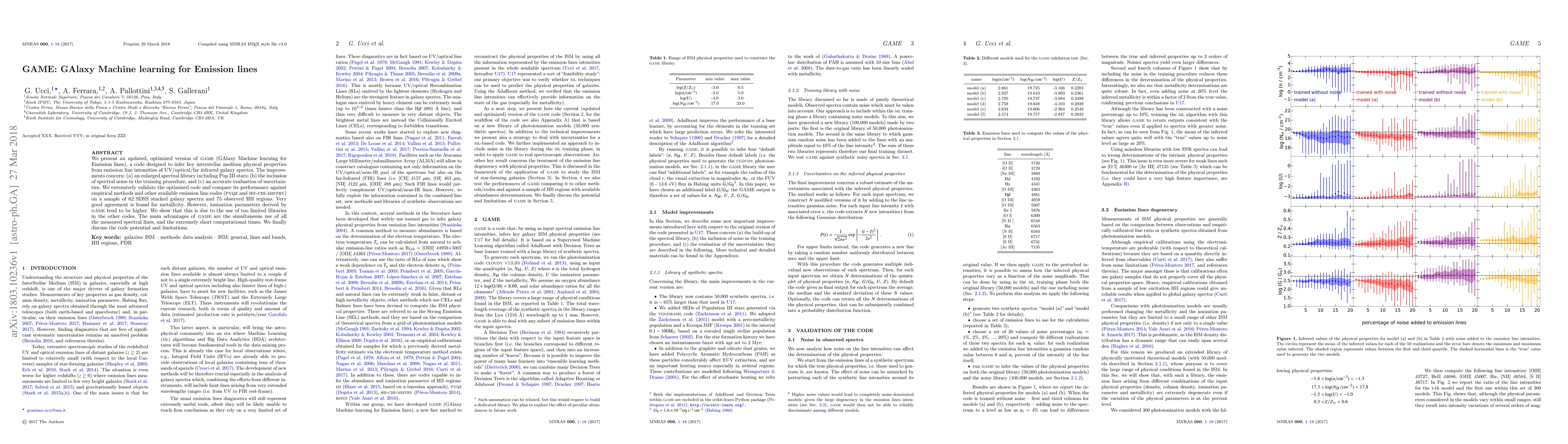 We present an updated, optimized version of GAME (GAlaxy Machine learning for Emission lines), a code designed to infer key interstellar medium physical properties from emission line intensities of UV/optical/far infrared galaxy spectra. The improvements concern: (a) an enlarged spectral library including Pop III stars; (b) the inclusion of spectral noise in the training procedure, and (c) an accurate evaluation of uncertainties. We extensively validate the optimized code and compare its performance against empirical methods and other available emission line codes (PYQZ and HII-CHI-MISTRY) on a sample of 62 SDSS stacked galaxy spectra and 75 observed HII regions. Very good agreement is found for metallicity. However, ionization parameters derived by GAME tend to be higher. We show that this is due to the use of too limited libraries in the other codes. The main advantages of GAME are the simultaneous use of all the measured spectral lines, and the extremely short computational times. We finally discuss the code potential and limitations.