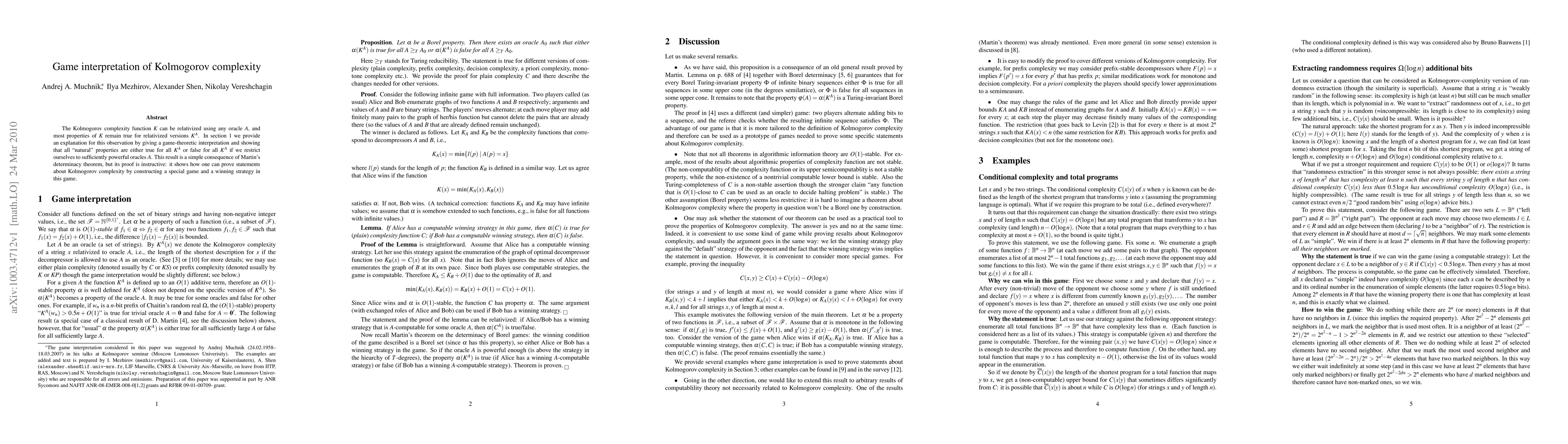 The Kolmogorov complexity function K can be relativized using any oracle A, and most properties of K remain true for relativized versions. In section 1 we provide an explanation for this observation by giving a game-theoretic interpretation and showing that all "natural" properties are either true for all sufficiently powerful oracles or false for all sufficiently powerful oracles. This result is a simple consequence of Martin's determinacy theorem, but its proof is instructive: it shows how one can prove statements about Kolmogorov complexity by constructing a special game and a winning strategy in this game. This technique is illustrated by several examples (total conditional complexity, bijection complexity, randomness extraction, contrasting plain and prefix complexities).