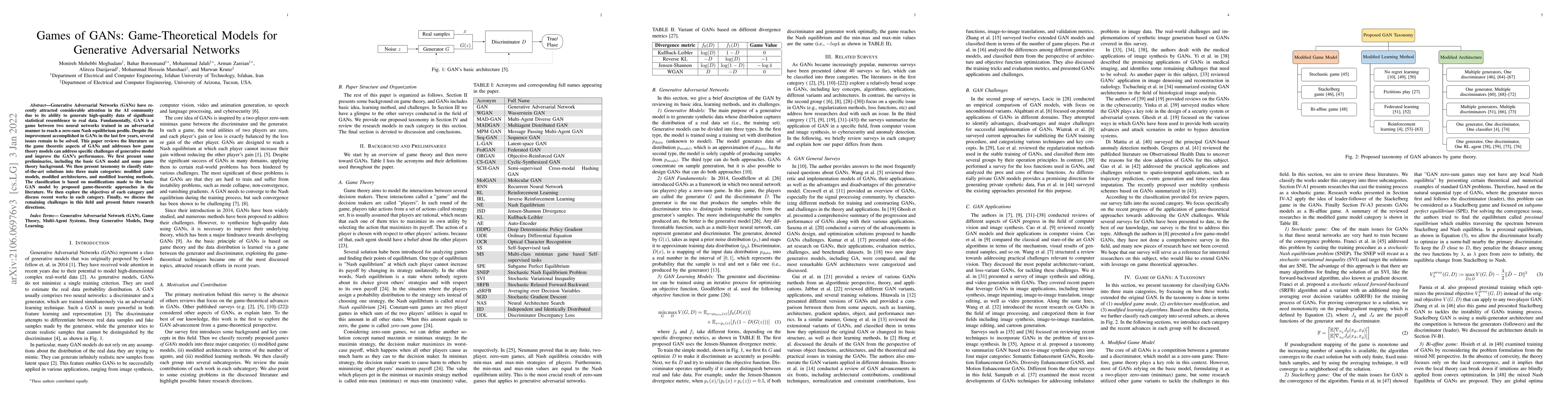 This paper reviews the game-theoretic models applied to Generative Adversarial Networks (GANs) to address their challenges and improve performance. It categorizes existing solutions into modified game models, architectures, and learning methods, and discusses future research directions.